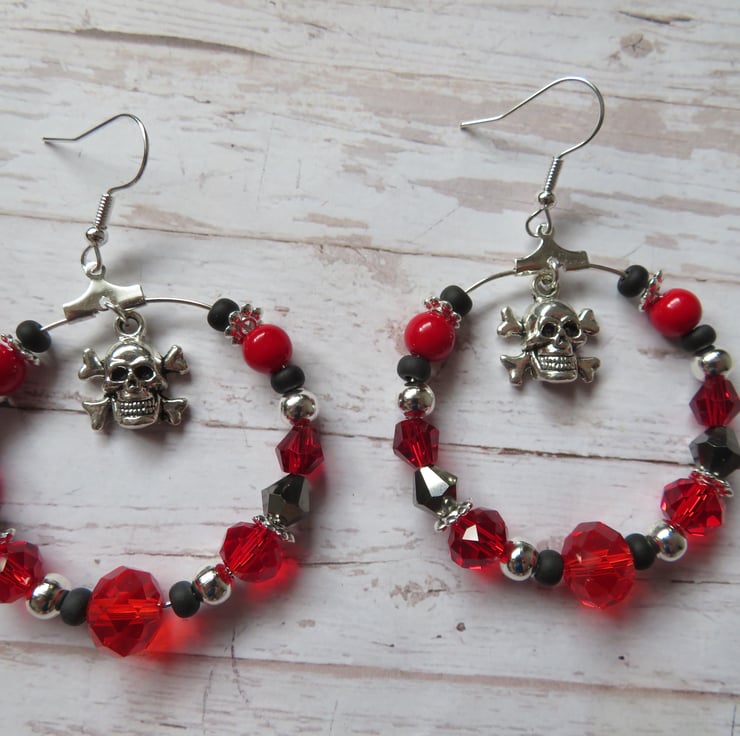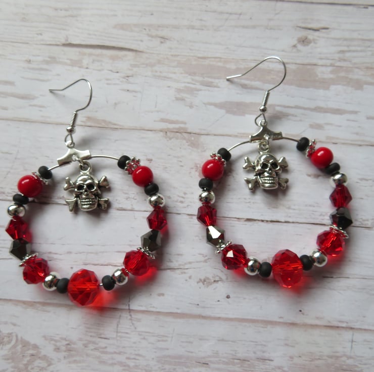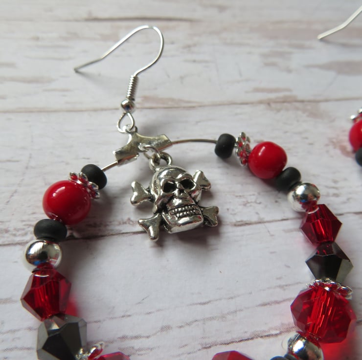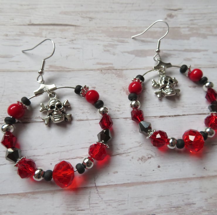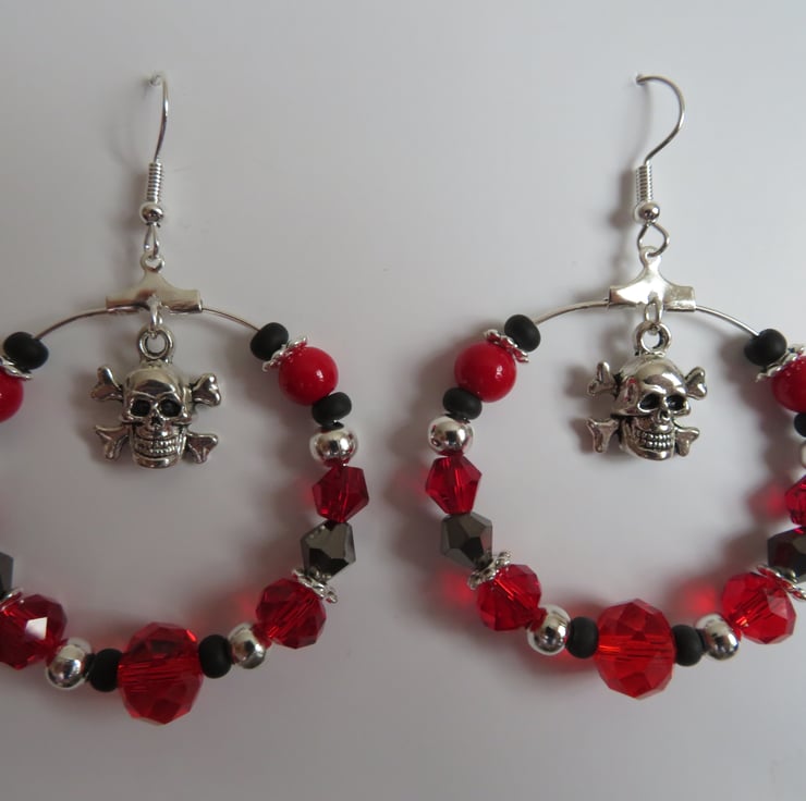 Each silver-tone hoop is intricately adorned with a striking mix of red glass rondelle crystals, hematite-coloured metallic bicone beads, deep red glass pearls, matte black seed beads, silver flower spacers, and silver-tone spacer beads. A small Tibetan silver skull and crossbones charm adds the perfect finishing touch, evoking a sense of adventure and vintage flair.
