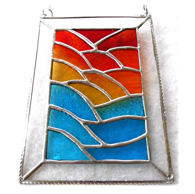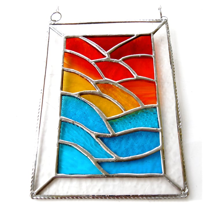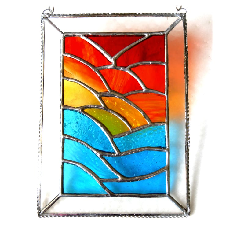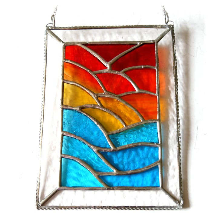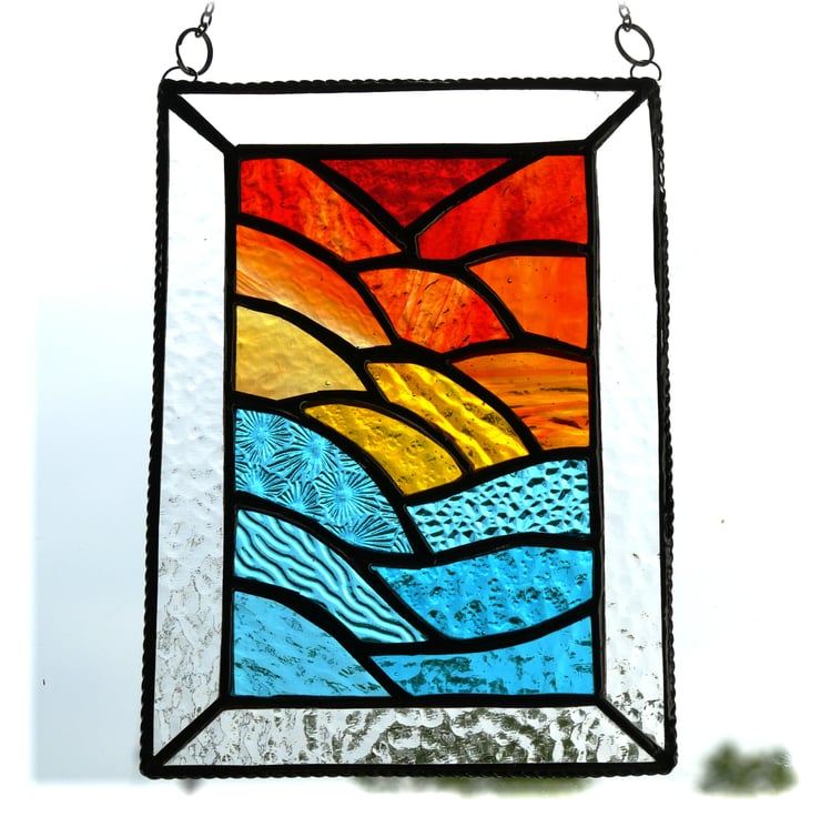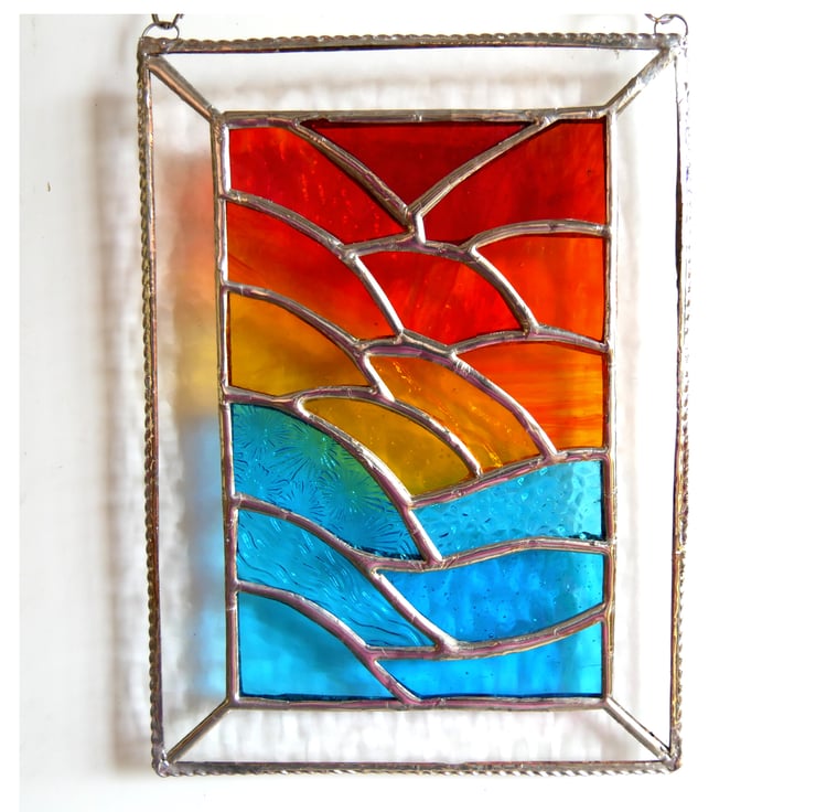 Using some rather gorgeous new types of glass, just arrived, I have formed ripples of sea at the bottom and of sunset clouds above with a yellow sun in the middle..