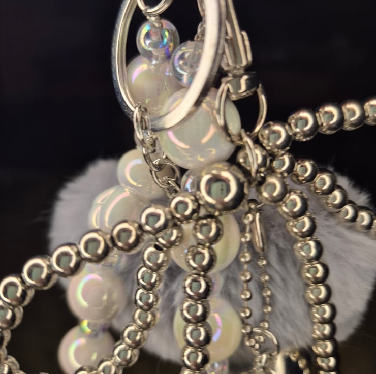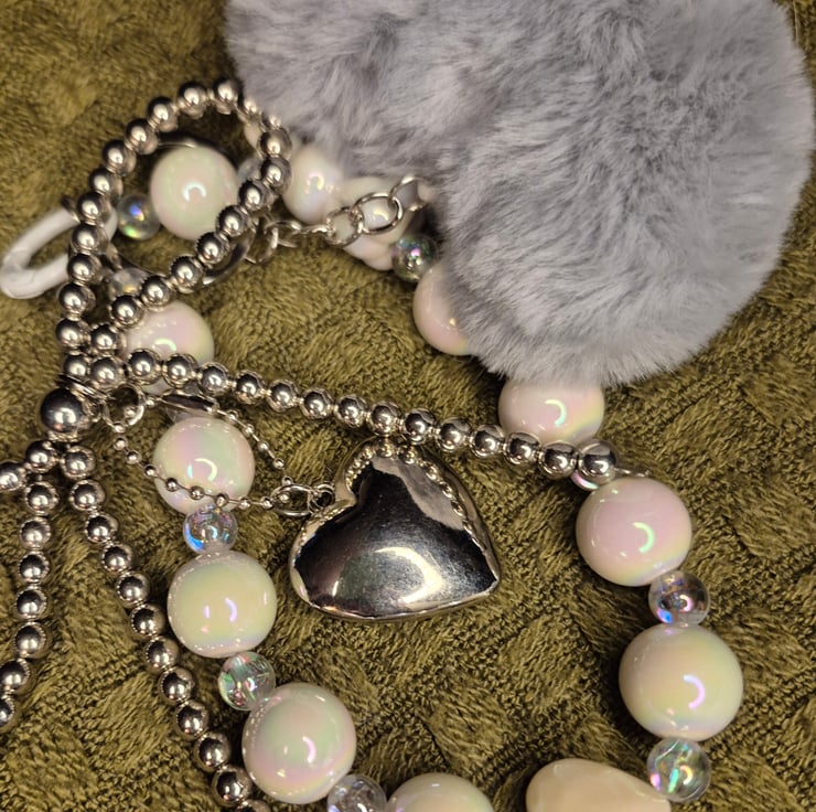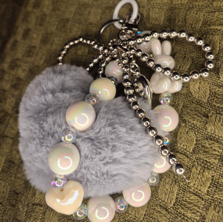 Quirky back charm, with heart shaped pom pom in grey. Bows and hearts make this a great accessory to have on your bag.