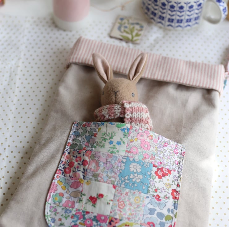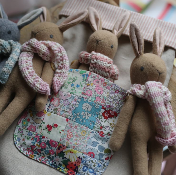 Inside the pocket is a little bunny with a hand knitted pink stripe scarf.