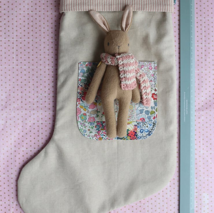 Each stocking is made from Essex Linen cotton and has a pink pinstripe cotton cuff. It has a hanging loop made from Liberty print fabric attached with a button.