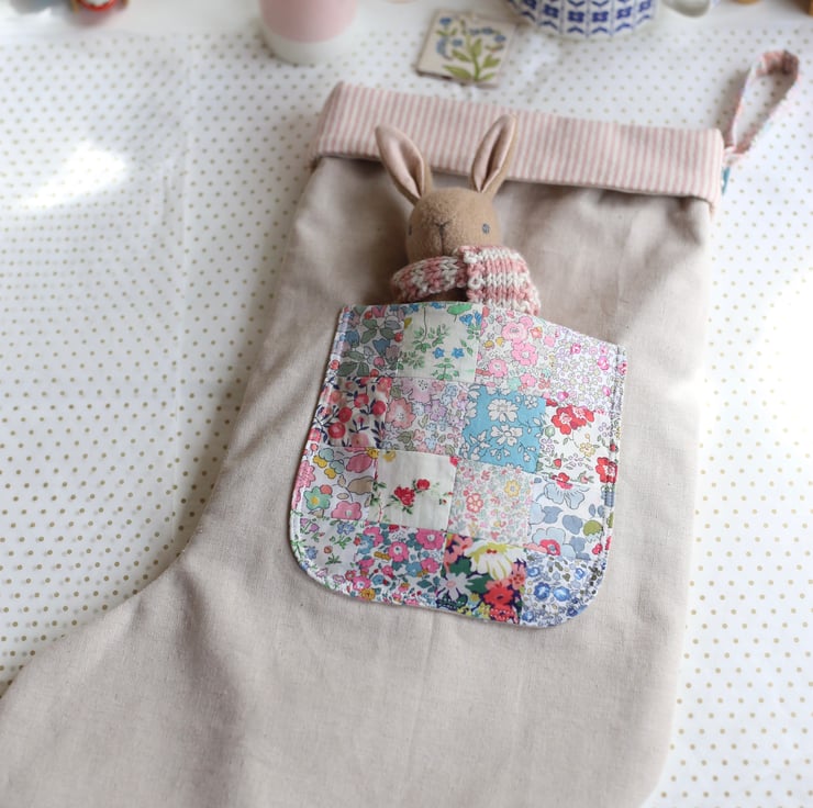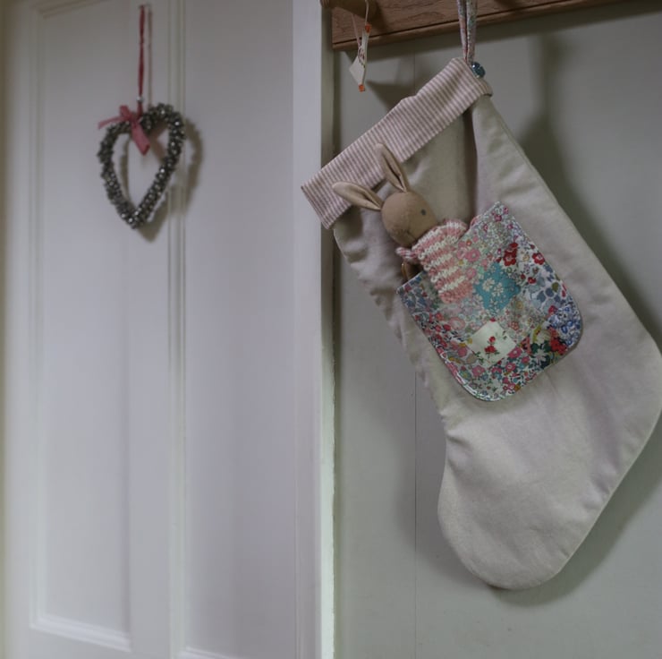 Each stocking has a patchwork pocket made from 16 beautiful Liberty of London prints including Betsy, Capel, Eloise and Betsy Ann.