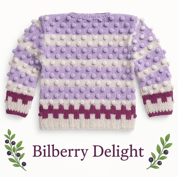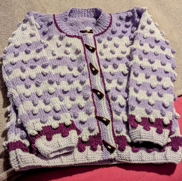 Named after a childhood memory, this cardigan is my pride and joy. Bobble knit cardigan in lilac, mauve and purple. Embroidered around neck and down the fronts, has given this cardigan a unique twist. The colours blend easily which should make this item a favourite in any little girls wardrobe. Finished off with purple Hounds Tooth toggles.