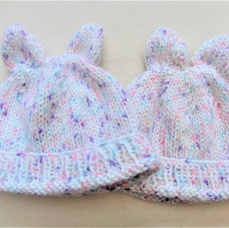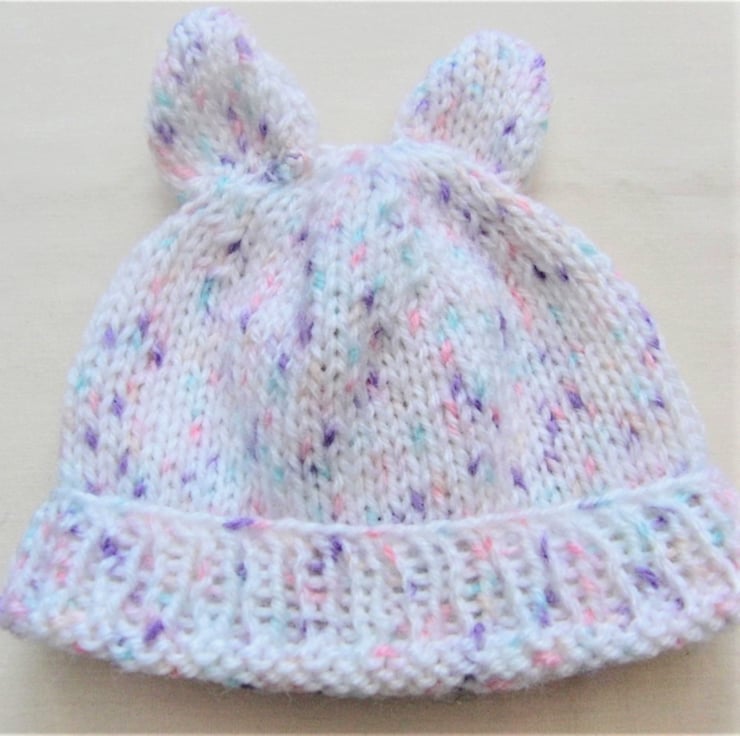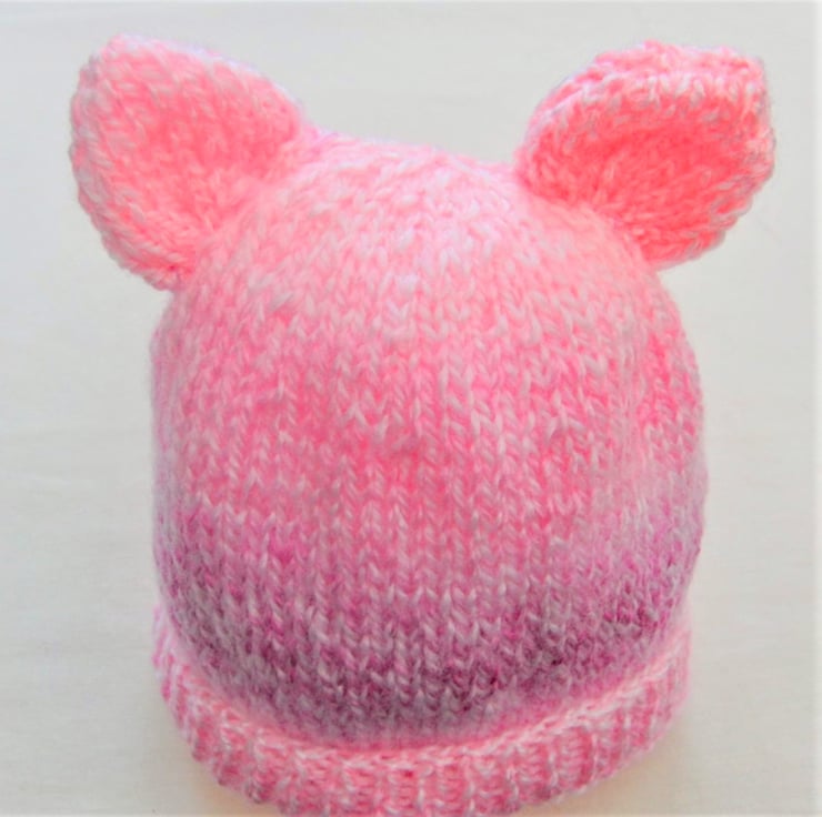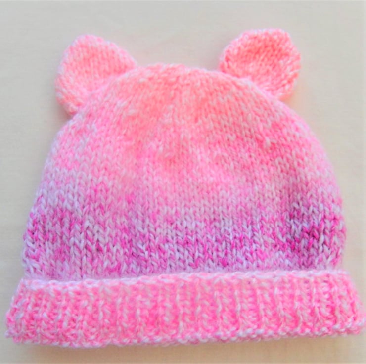 Fun yet Practical hat set , including a hat with ears. The hat measures 14 inches around the head and is made to fit a child approximately 0 - 9 months old. It is knitted in variegated pink double knitting weight yarn.