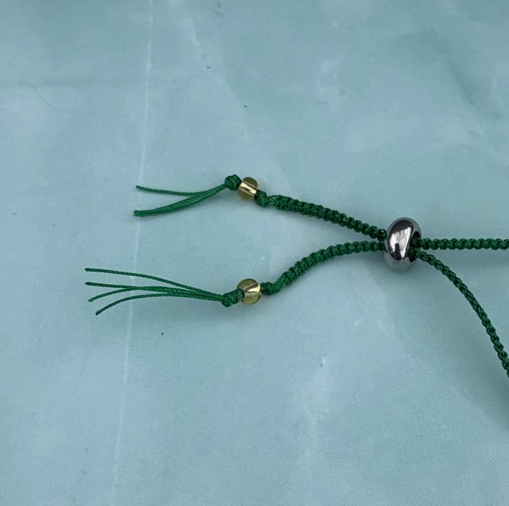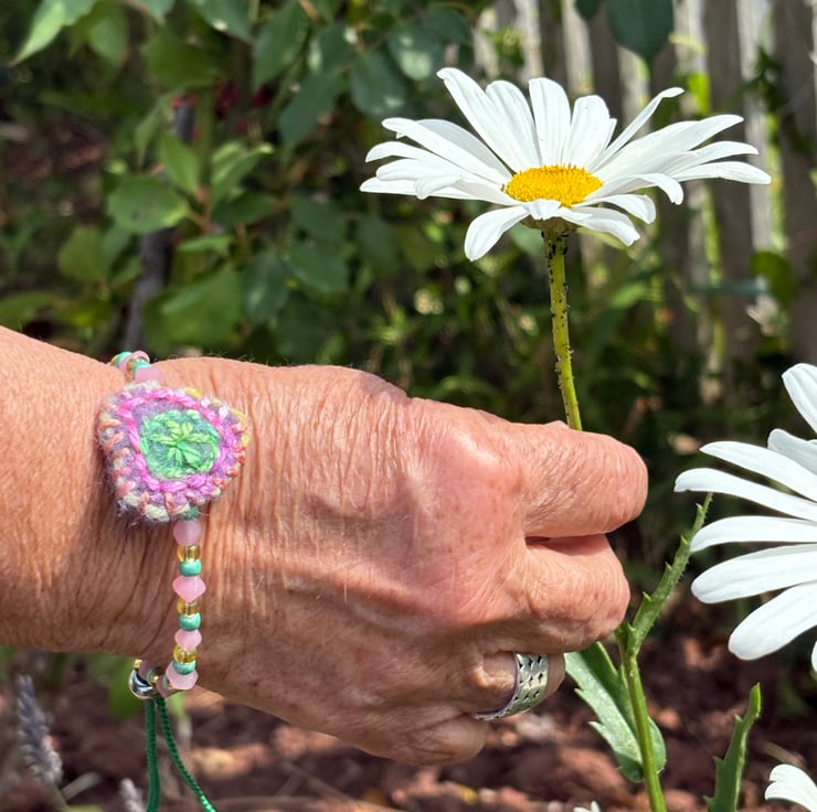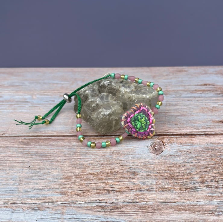 This pretty bracelet is made from glass beads and a needle felted and embroidered ‘charm’ strung on waxed cotton which has been braided at each end using a square knot macrame technique. It is secured with a silicon bead fastener which allows it to be slipped easily over the hand and secured as you like to wear it (tight or looser).