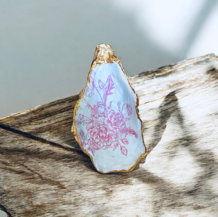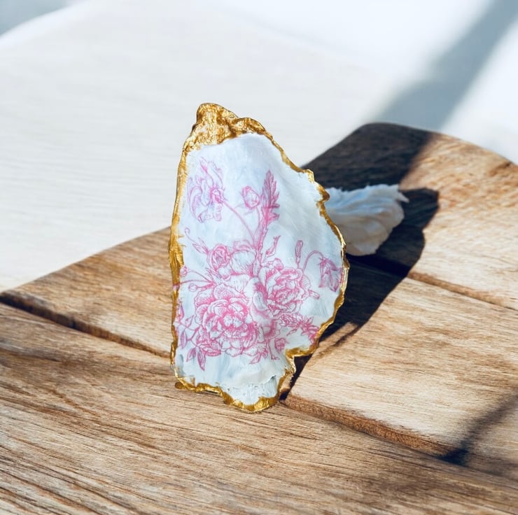 These Pembrokeshire Oyster Shells have been cleaned, and sealed using quality eco friendly products. I have then decoupaged with a beautiful elegant feminine design. I have use gold metallic paint to give them the perfect finish. Perfect for your rings or trinkets in the bathroom. The shells are between 9-10cm in length. Your shells will be securely packaged and despatched in a timely manner.