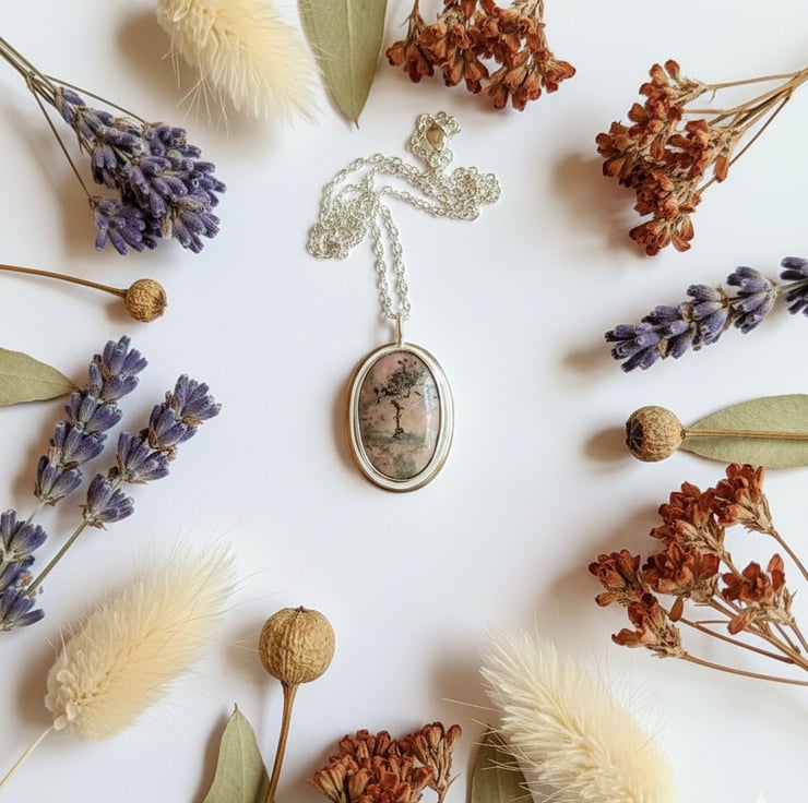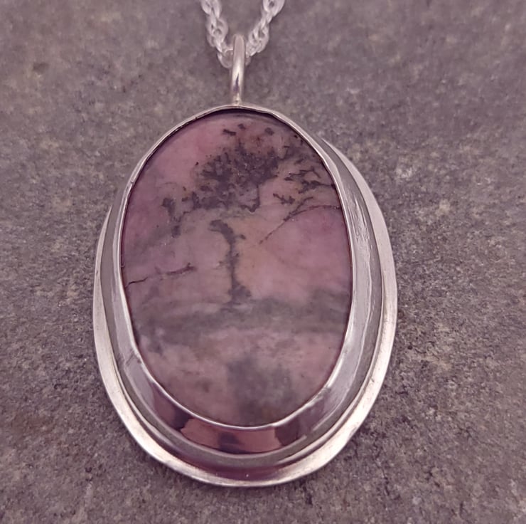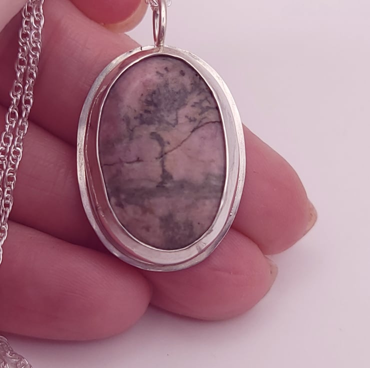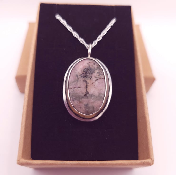 A subtle pink shade of gemstone with natural inclusions forming a gorgeous unique pattern detail. In my mind I see a lone tree on against the sky.