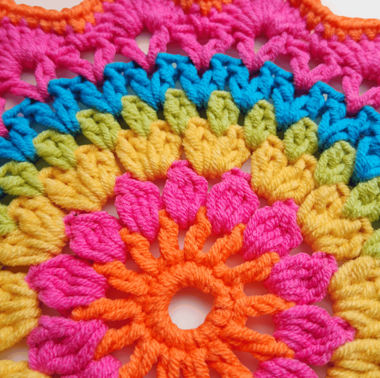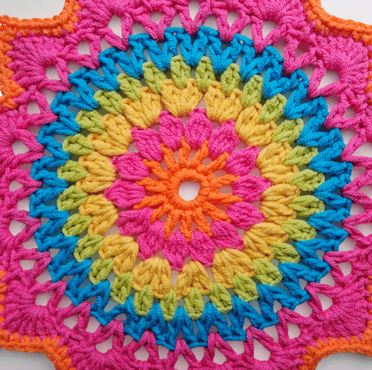 Bright crochet mandala doily. 20 cm in diameter. Perfect for giving your table a pop of colour. Crocheted in vibrant cotton blend yarn for colour retention and ease of wash.