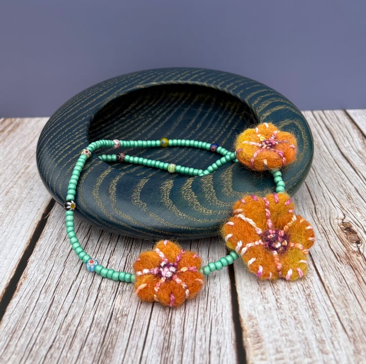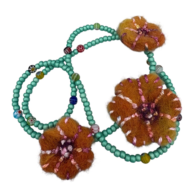 This striking necklace is made from glass beads and 3 needle felted and embroidered flowers strung on two strings of nylon. It is secured with a lobster clip fastener.