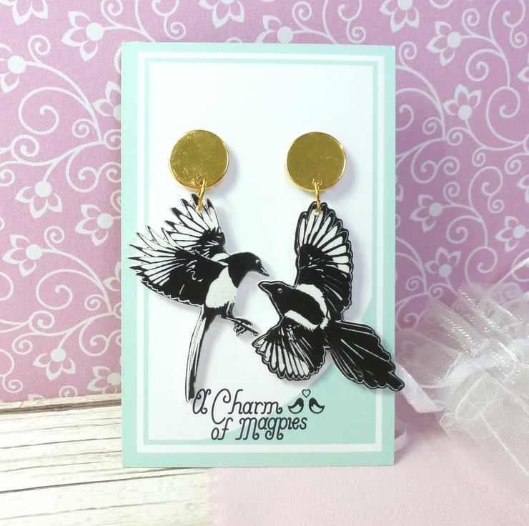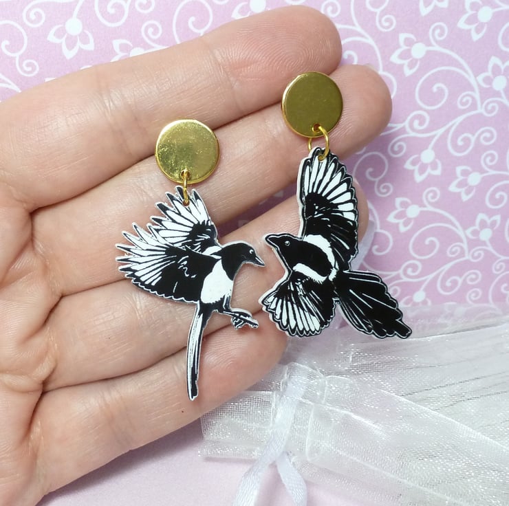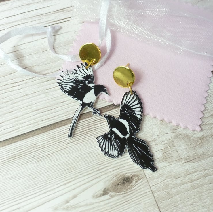 Two for joy magpie earrings on gold plated Stainless Steel studs, two mismatched magpies earrings, gift for corvid lovers, monochrome bird earrings, large plastic black and white earrings for birdlovers. These lightweight, laser engraved and cut, earrings are made with hypoallergenic gold plated Stainless Steel studs protect delicate earlobes. Also available with gold plated ear wires and plain stainless steel wires and studs
