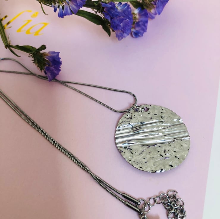 Silver coloured hammered metal pendant on either a faux leather necklace or silver coloured snake chain. You choose, but do let me know. :) The faux leather necklace is 43cms which allows you to choose to wear it long or short. Just tie it at the back of your neck. I usually tie mine in a bow. This is finished off with a silver coloured bead and fancy clasp.