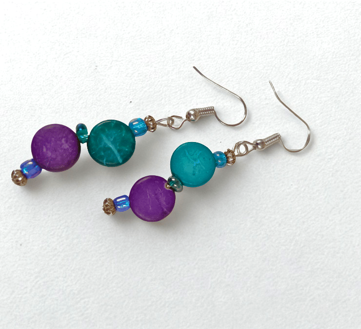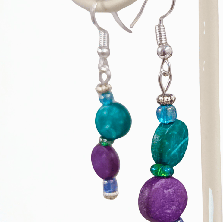 These earrings are so simple but are my absolute favourites! Made with recycled small, flat, wooden disc beads, glass beads and tiny Tibetan silver, hanging on nickel free sterling silver hooks. Very lightweight, great for day wear or going out. Wrapped in tissue with ribbons.