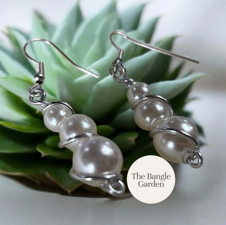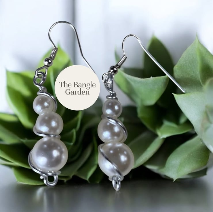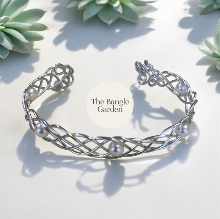 Handmade wire woven silver coloured bangle with faux pearls. Made with 1mm aluminium wire using 5 strands of wire decorated with pearls. Matching earrings available.