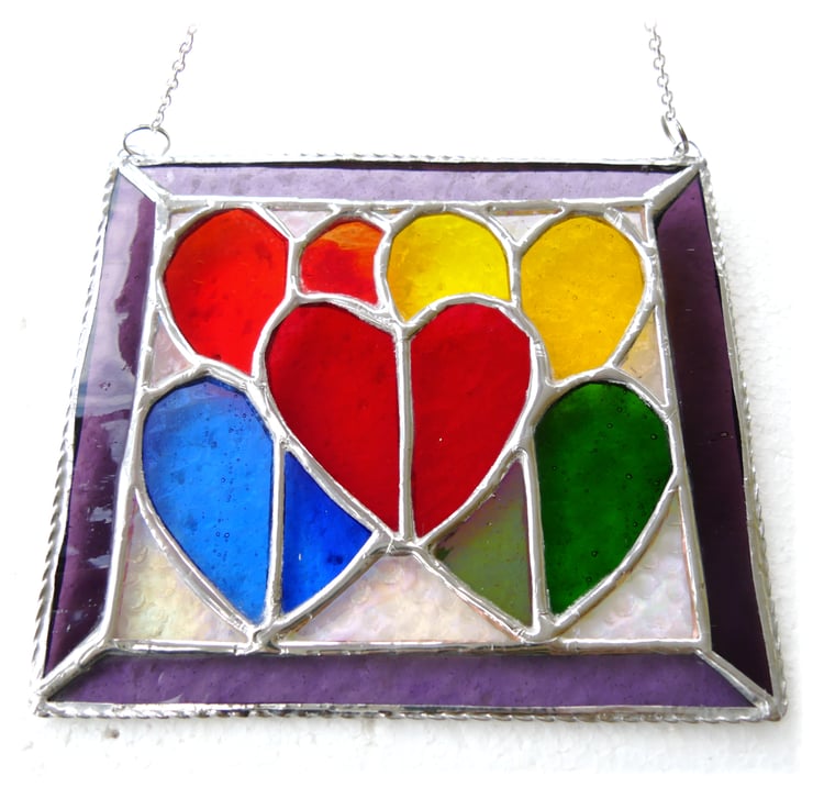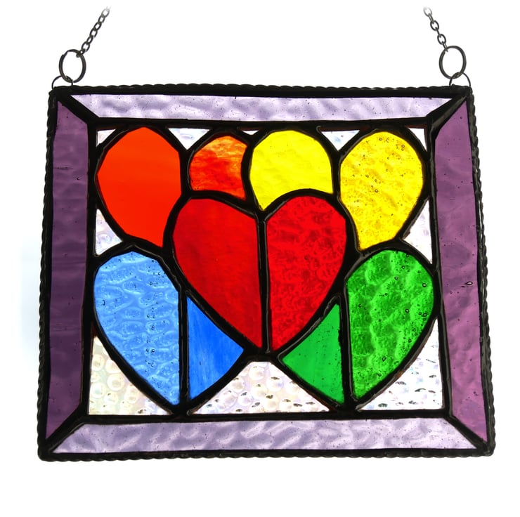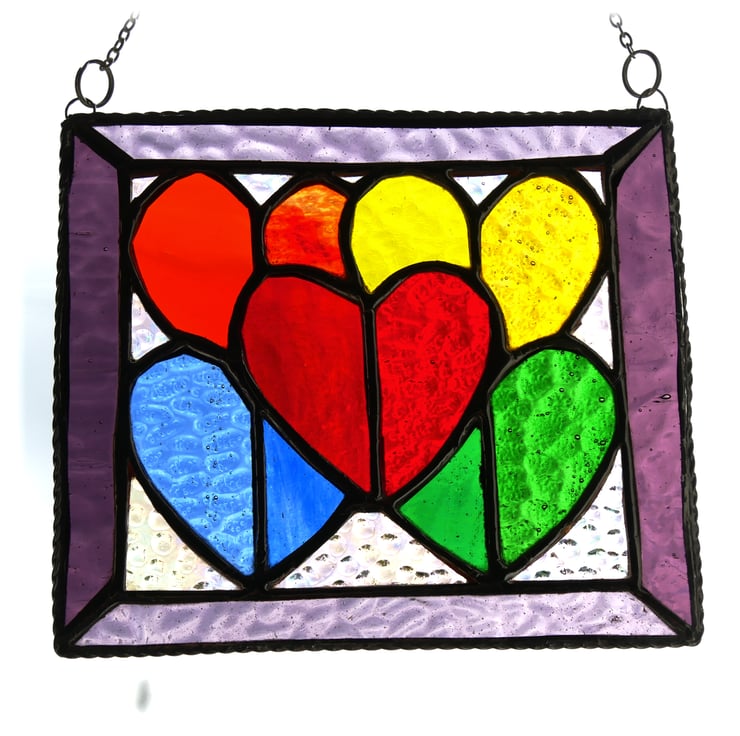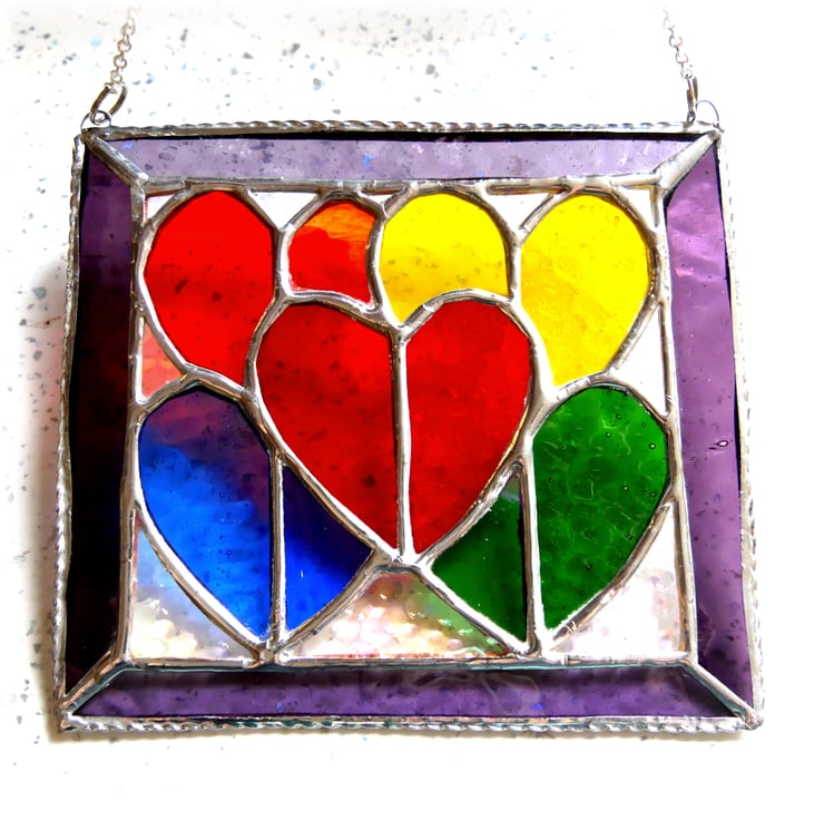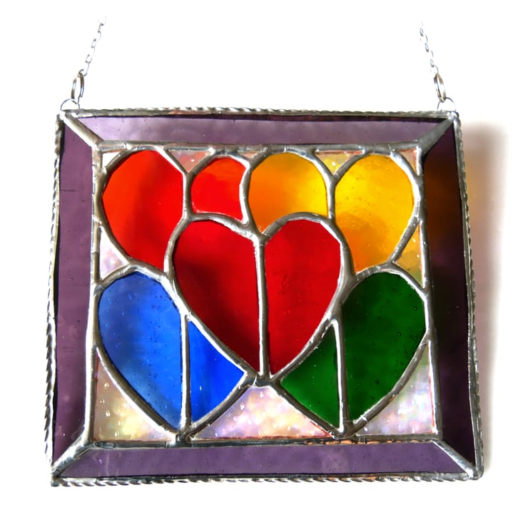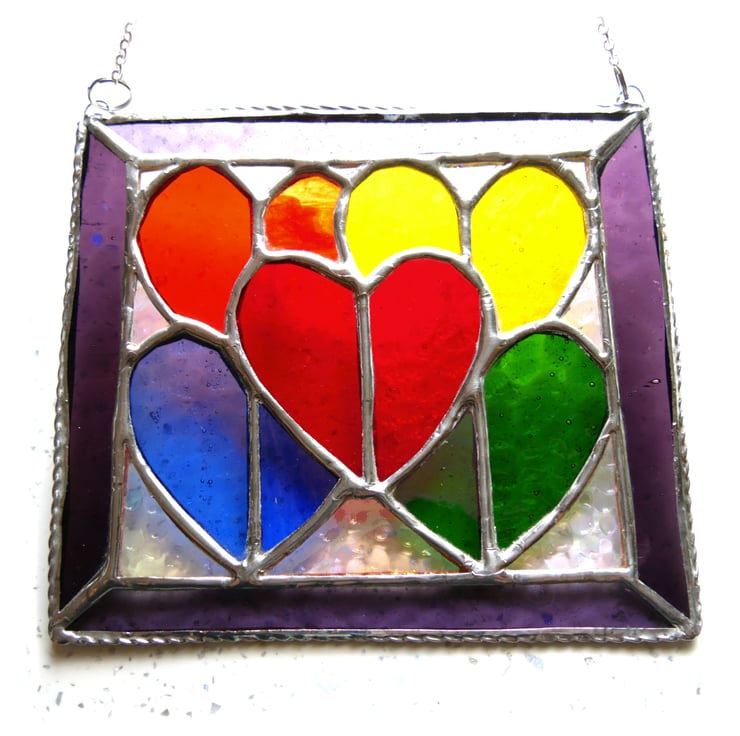 I've made 5 hearts in the first 5 rainbow colours using two tones for each colour. .The other two rainbow colours: indigo, violet complete the rainbow round the frame.