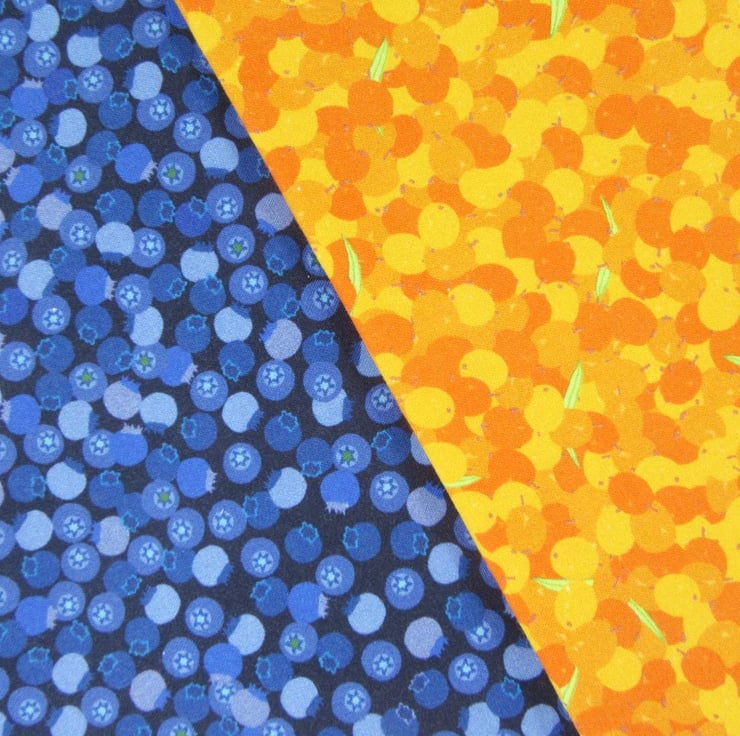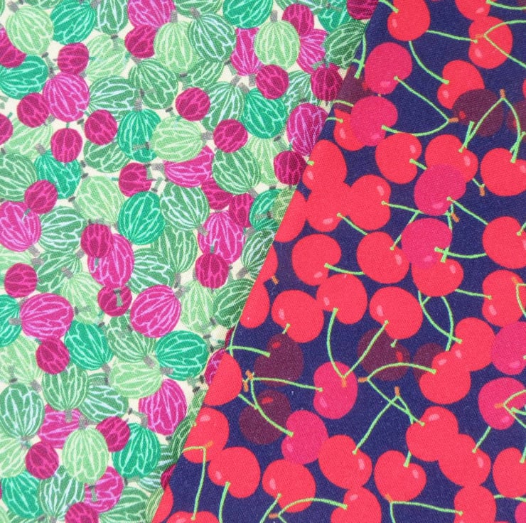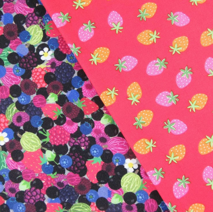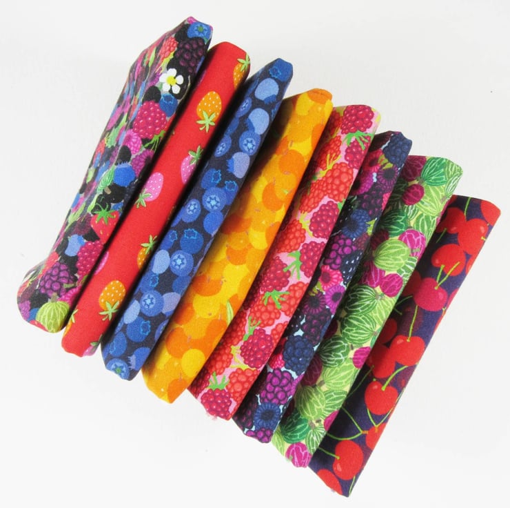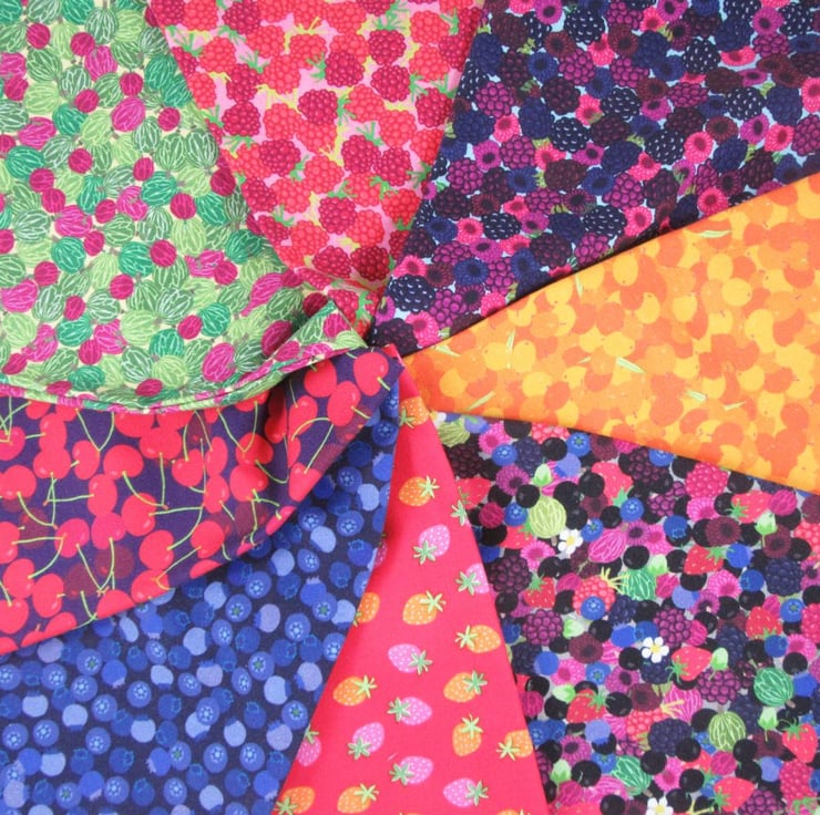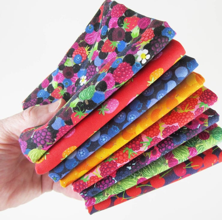 A colourful collection of eight fat quarters each depicting a different print of fruits. The fabrics are 100% cotton suitable for patchwork and other crafts.