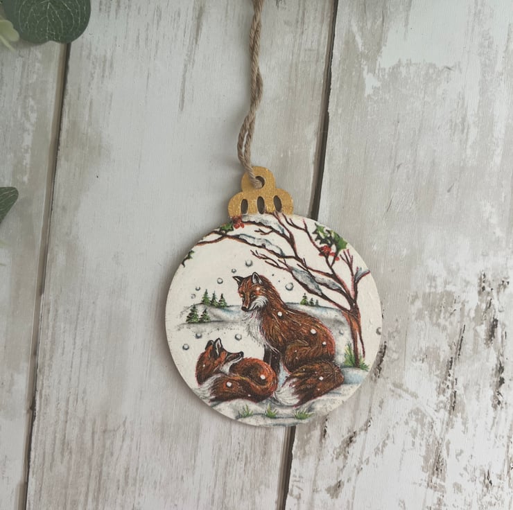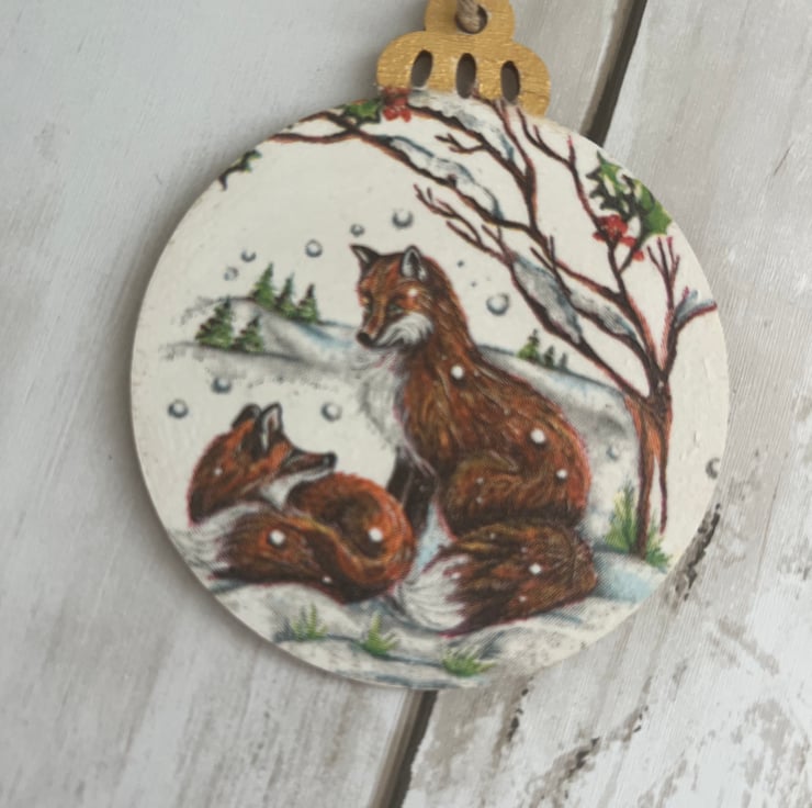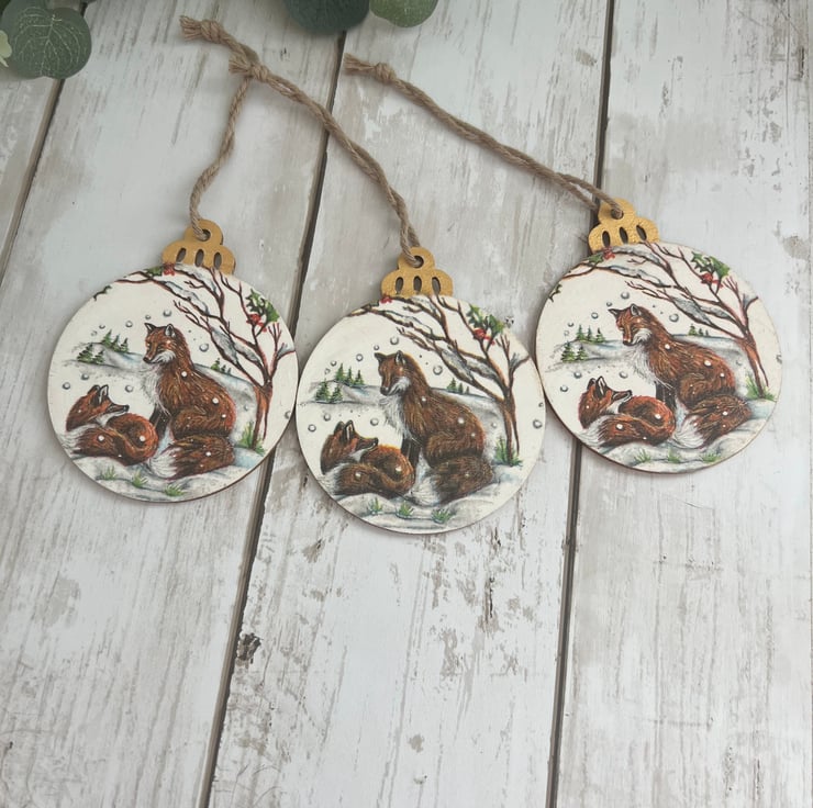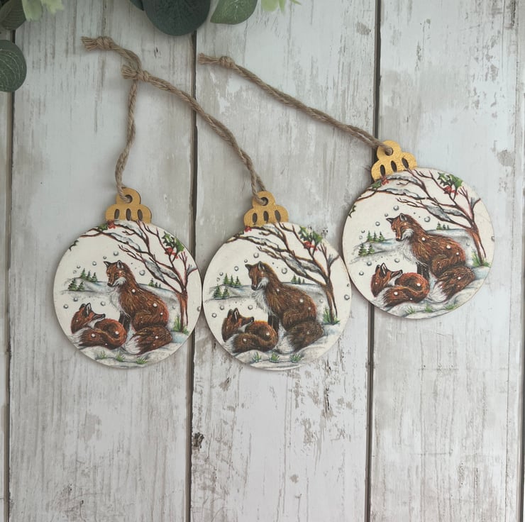 Handmade set of 3 wooden bauble hanging decorations which have been decoupaged on one side with a lovely fox design and gold finish to the top.