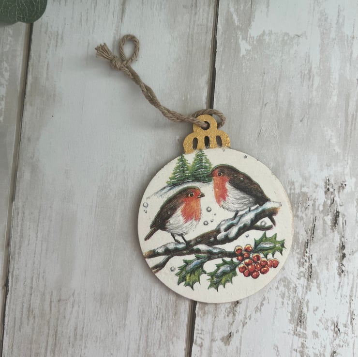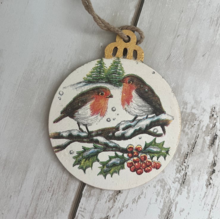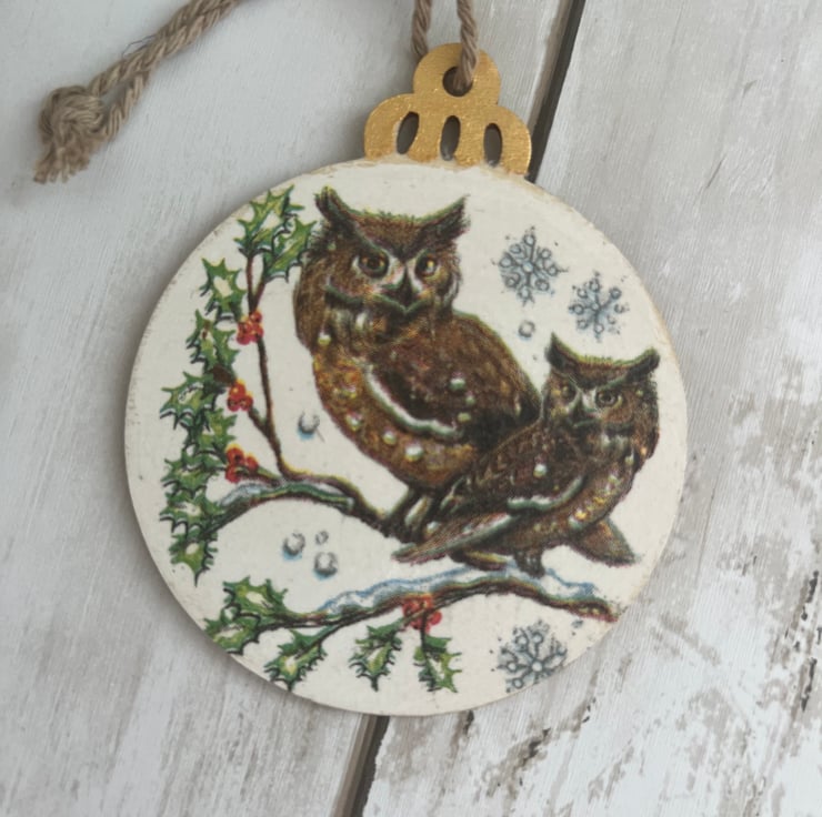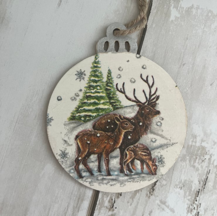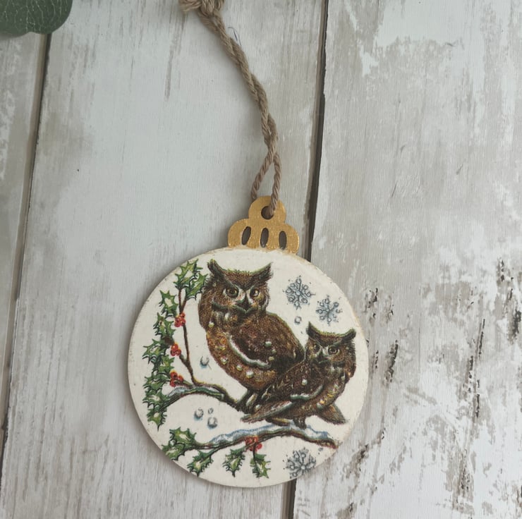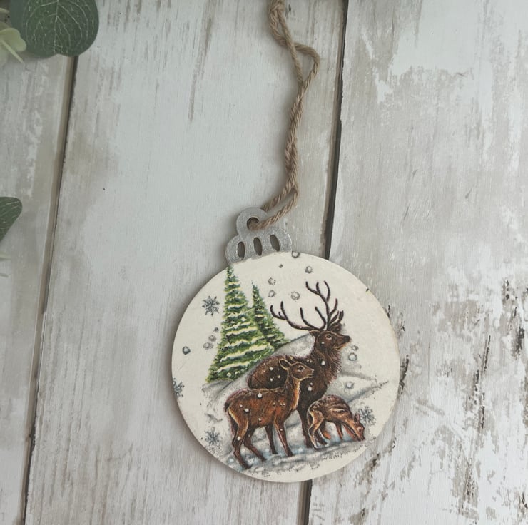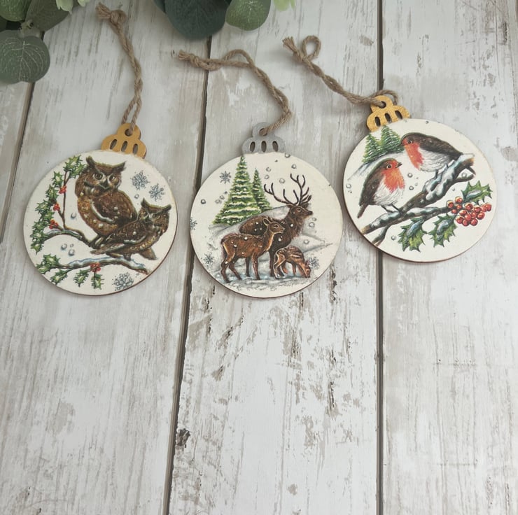 Handmade set of 3 wooden bauble hanging decorations which have been decoupaged on one side with a lovely robin, owl and deer design and gold and silver finish to the top.