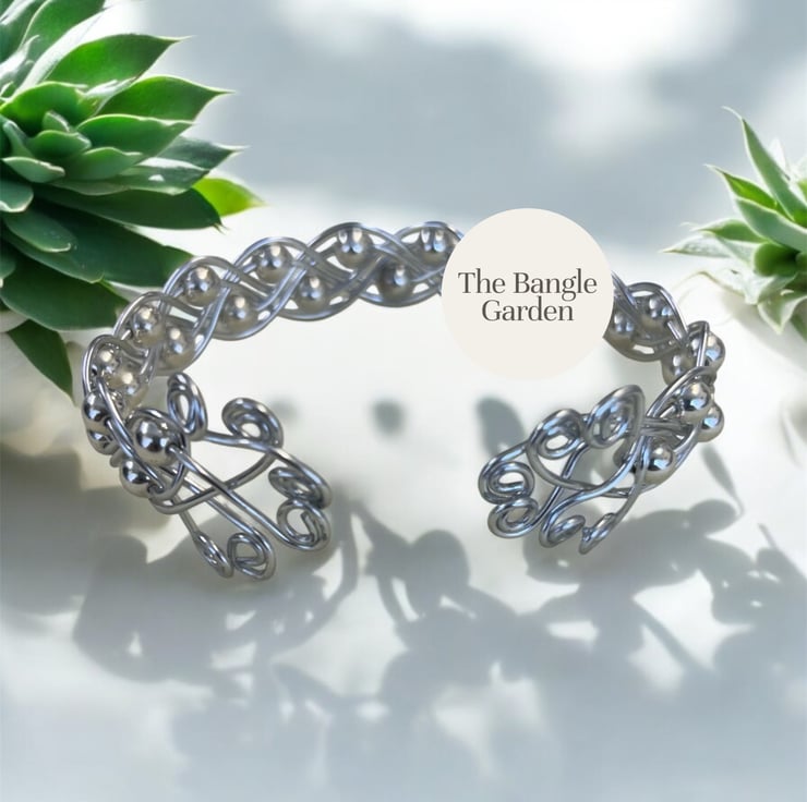 Handmade wire woven silver coloured bangle with silver beads. Made with 1mm aluminium wire using 6 strands of wire decorated with silver beads.