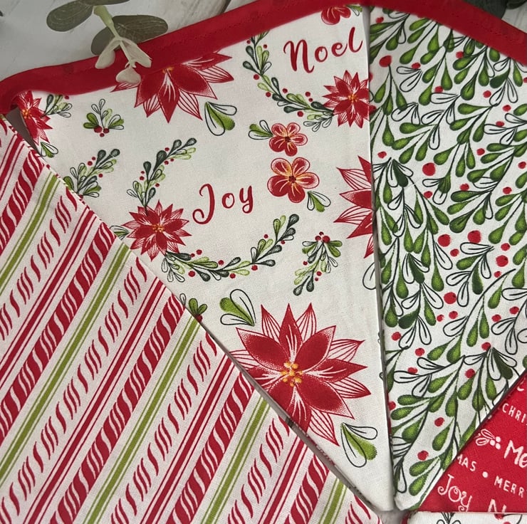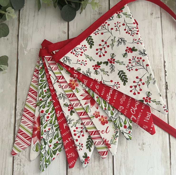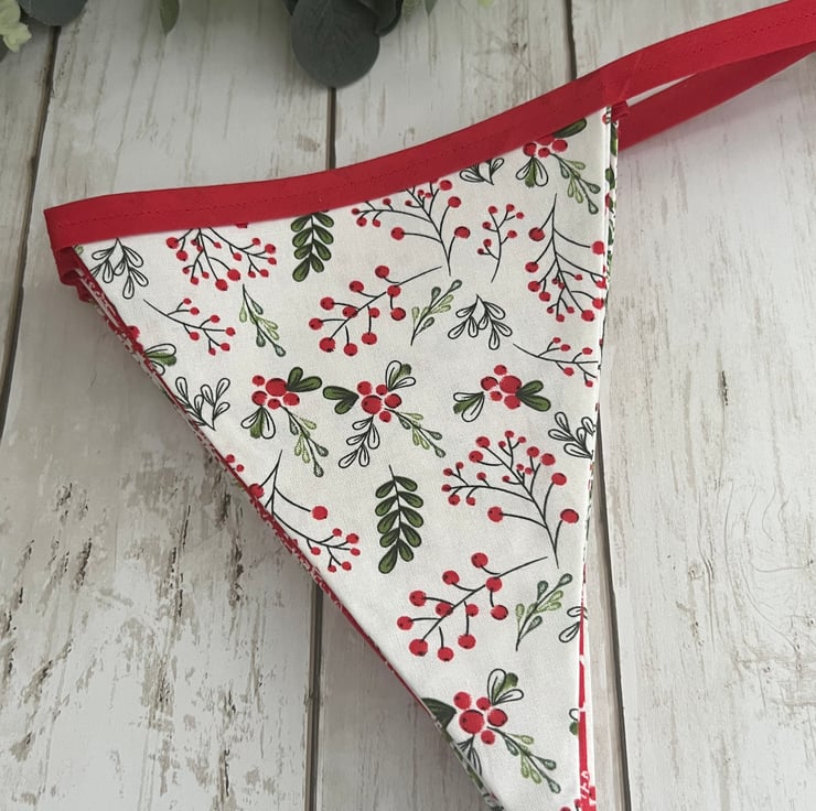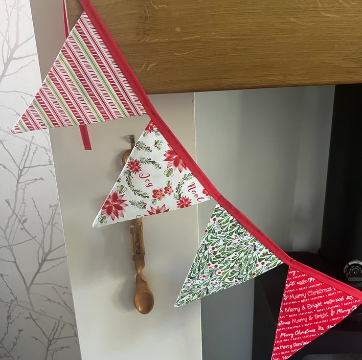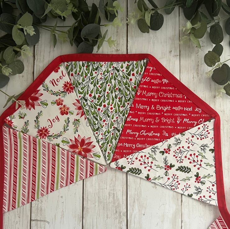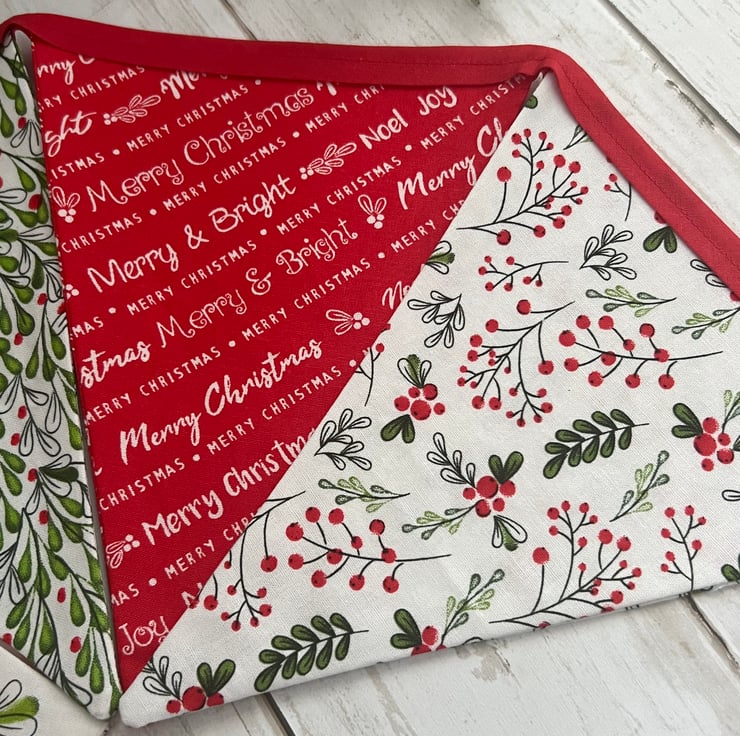The 100% cotton fabric is a mix of red, white and green Christmas fabrics finished with red cotton bias binding.