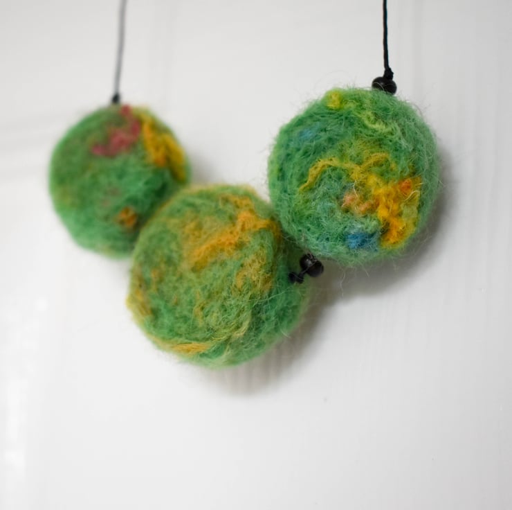 Each chunky wool bead is wet felted by hand using soft green roving, with flecks of yellow, rust, and blue peeking through like wildflowers on a forest floor. The beads are strung on a strong black cord with matte seed bead spacers and an adjustable sliding knot for versatile wear.