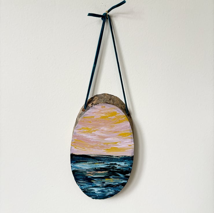 Original Seascape Hanging Wooden Log Slice entitled 'Grace'. Hand painted in acrylic with teal velvet ribbon so it's ready to hang.