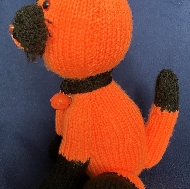 Halloween Cat is knitted in shades of pumpkin orange and black acrylic yarn.