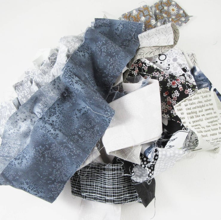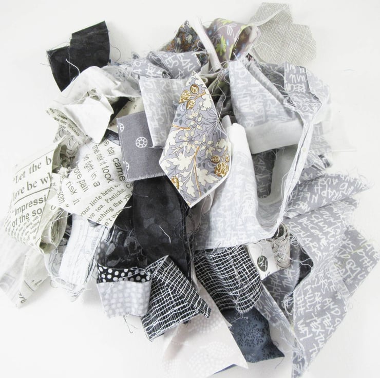 A 200g pack of cotton fabrics in shades of grey and black. Ideal for making patchwork string quilts.