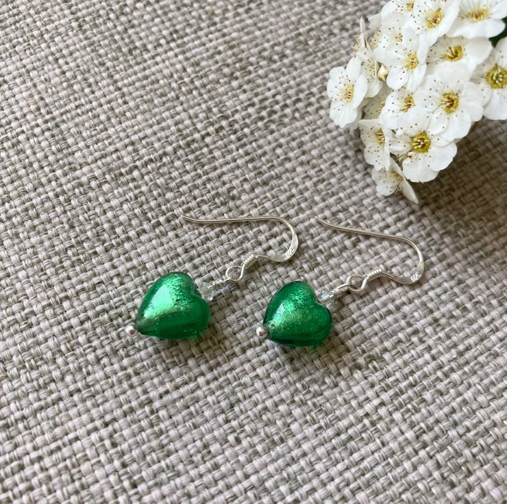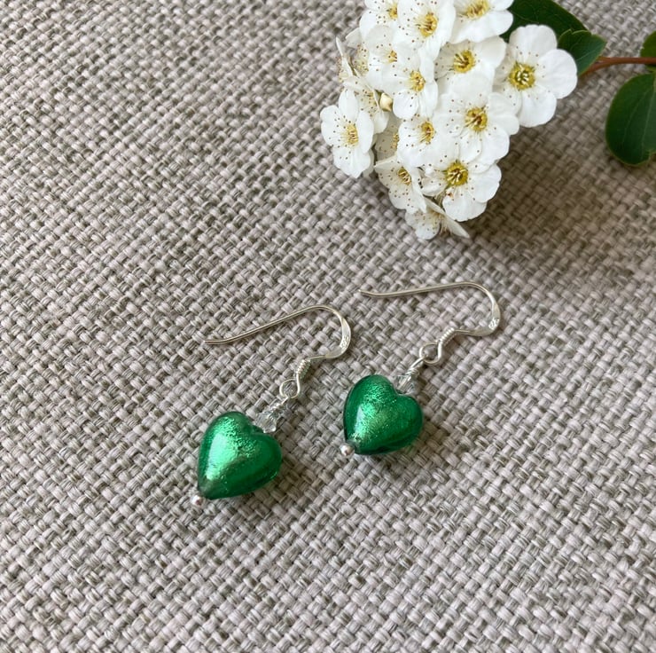 Stunning earrings made with green Italian Murano glass hearts, with Swarovski crystals and sterling silver hooks. The hearts are approximately 1cm in diameter and the earrings are approximately 3cm in length. Murano glass is made on the Venetian island of Murano using traditional techniques. It is truly stunning and makes lovely eye-catching jewellery to finish off any outfit, day or night!
