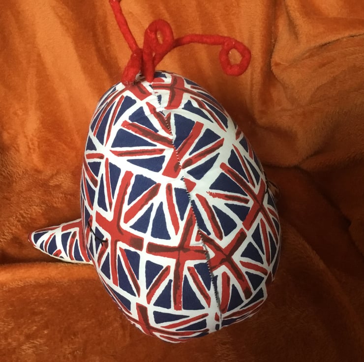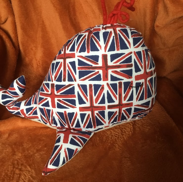 A sleepy eyed Doorstop Whale made from a cotton Union Jack fabric. The doorstop measures approximately 42cm in length and weighs just under 1kg (approximately 850 grams). It is filled with rice which is encapsulated in an inner bag.
