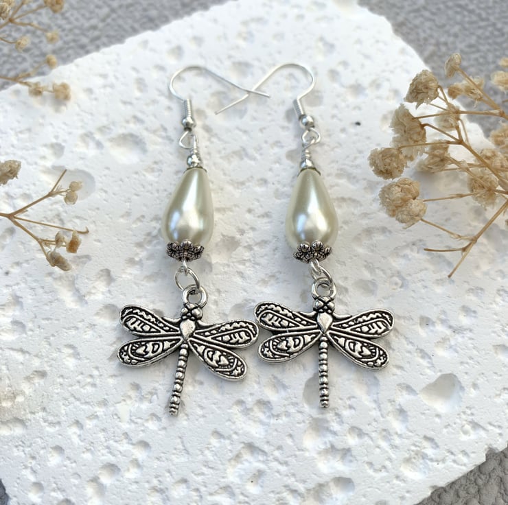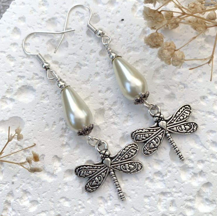 - Vintage Style Pearl Teardrop Dragonfly Silver Drop Earrings –