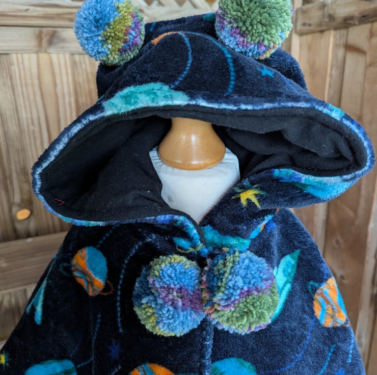 Super soft fleece with a dark blue background and planet design. It is fully lined with cotton flannelette, hand made pom poms on the hood and front. Velcro fastening for easy wearing. Makes an ideal gift. Four sizes: Extra small: 1- 3 months (7 - 13lbs): Small 6 months (13 - 18lbs): Medium:12 months (18 - 21lbs); Large: 18 months.(21 - 24lbs).
