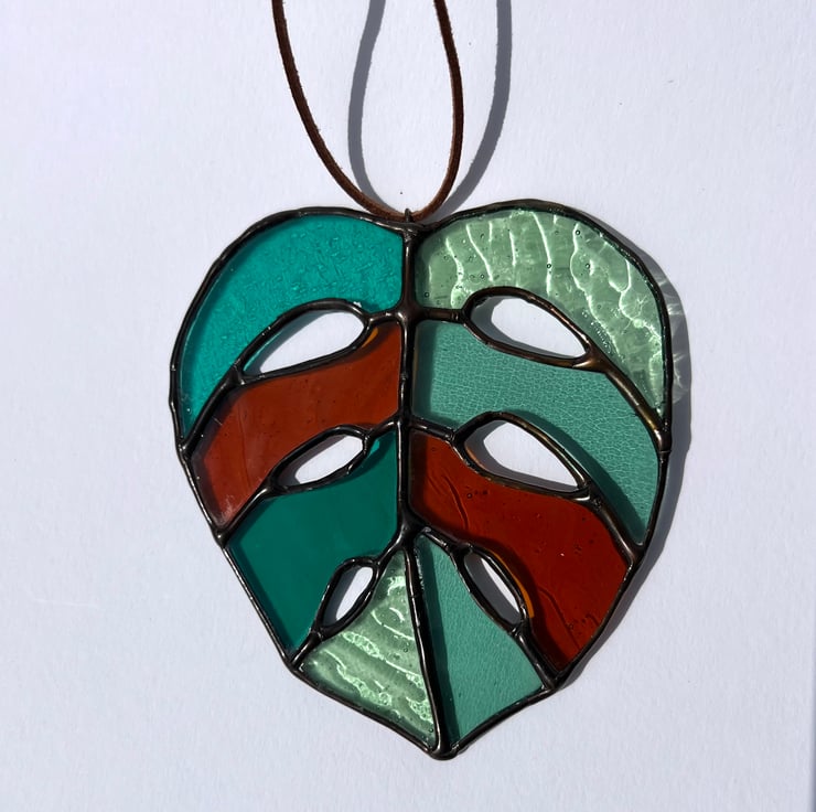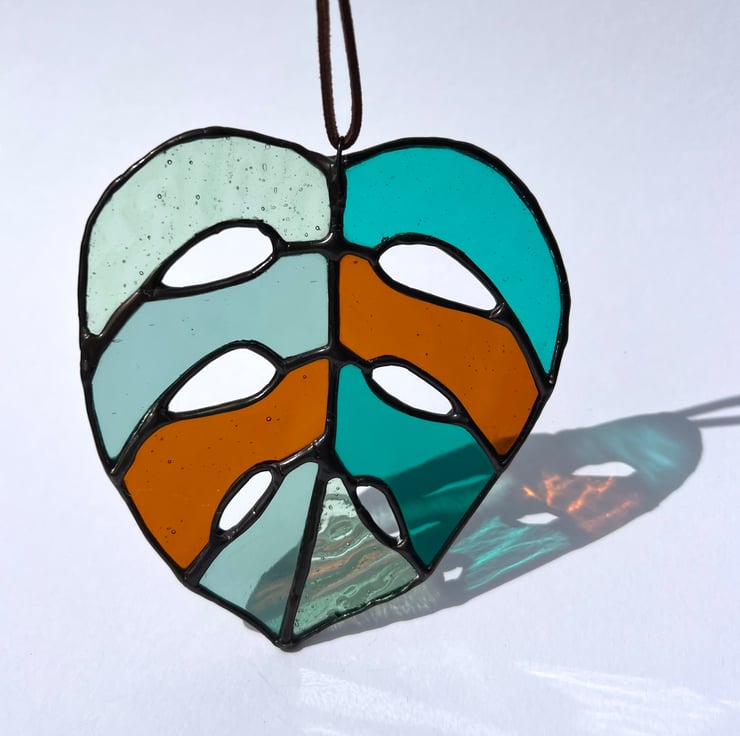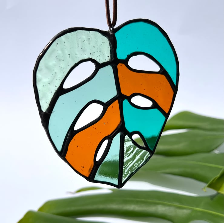 A striking stained glass plant leaf design in teal, mint, pale green, and deep amber. The monstera plant in an on trend colour way. The piece casts strong, colourful refractions into your space!