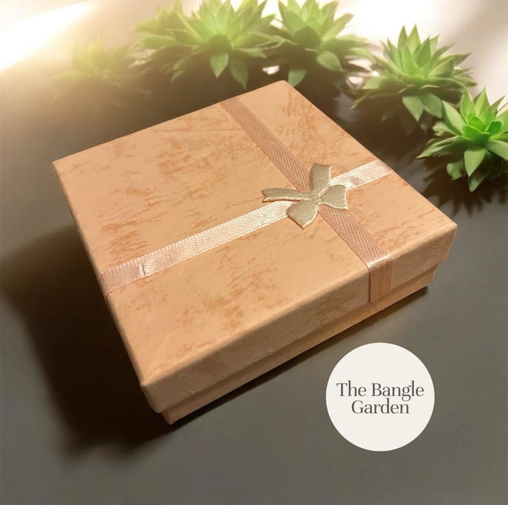 Cardboard box with silk lining, only available with the purchase of a bangle from The Bangle Garden