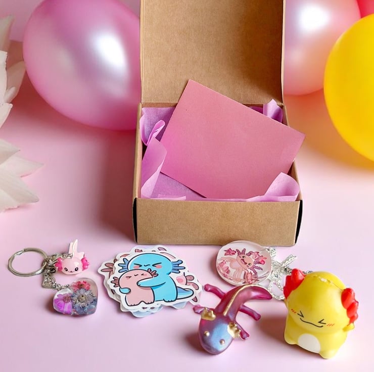 Looking for the perfect gift for an axolotl lover? This adorable Axolotl Surprise Box is filled with cute, handmade and thoughtful goodies that are sure to delight!