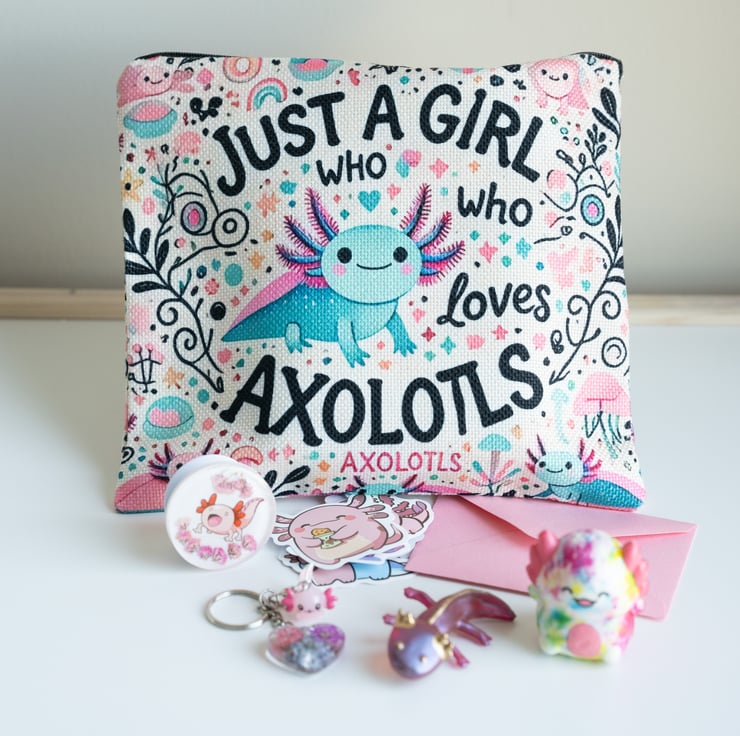 Boxes with 5 or 6 items also include a cute axolotl-themed pouch or cosmetic bag – perfect for storing small treasures or daily essentials.