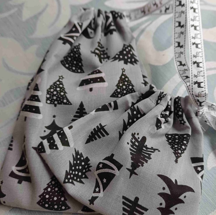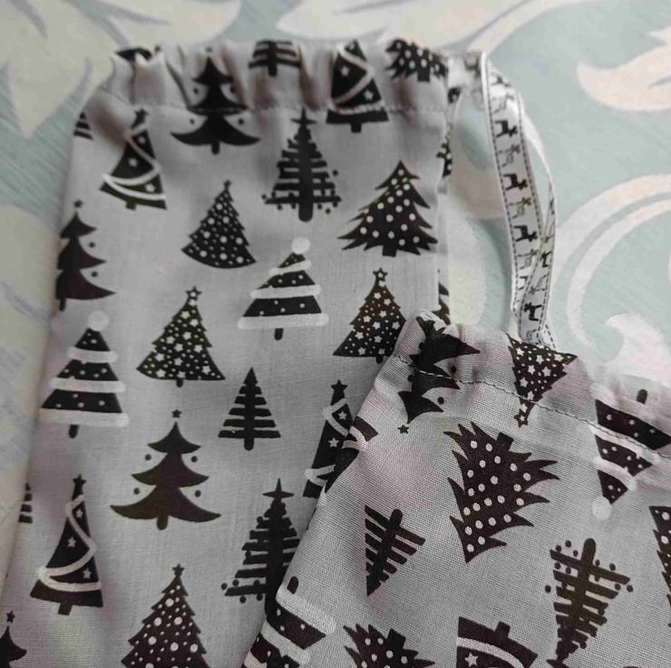 2 smaller bags for special Christmas gifts. Made in lovely cotton grey fabric to reuse over and over