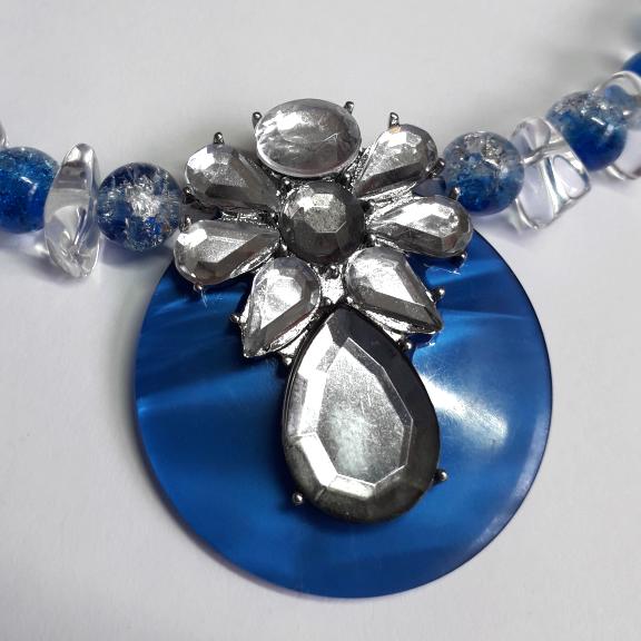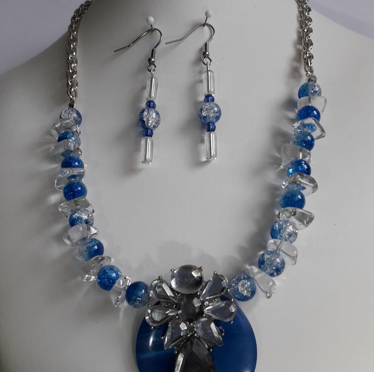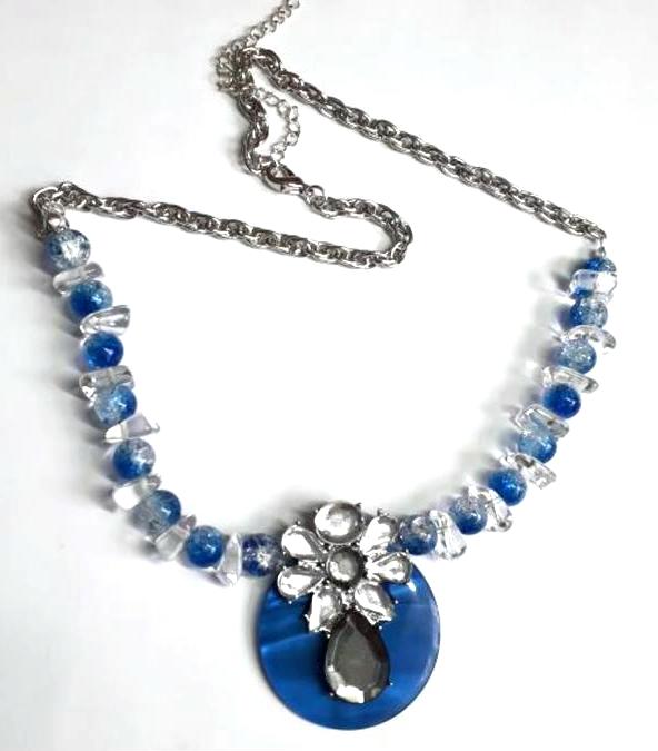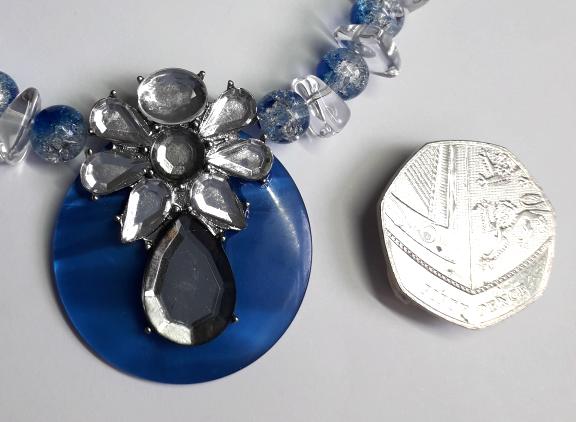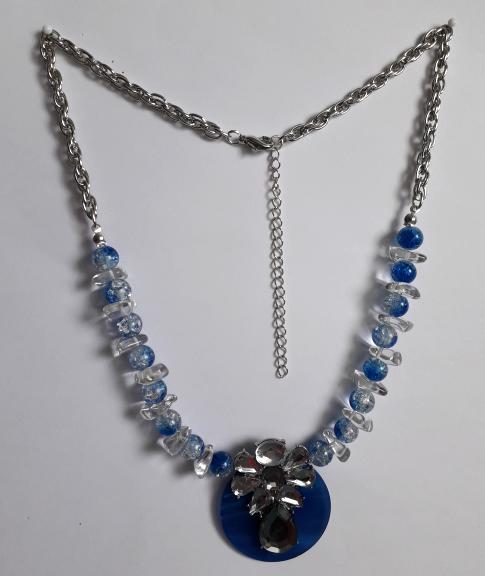 For the pendant on this necklace I have used a lovely royal blue vintage button to which I have attached part of a clear glass vintage necklace, the necklace is made up with blue and clear crackle glass beads and clear square flat glass beads and finished with a vintage silver tone chain, it fastens with a silver plated lobster clasp.