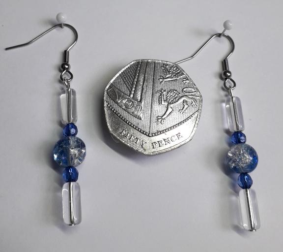 The earrings consist of a single crackle bead with small blue glass beads and clear glass tube bead either side, they are on surgical steel hooks and are 6cm/2.5" long.