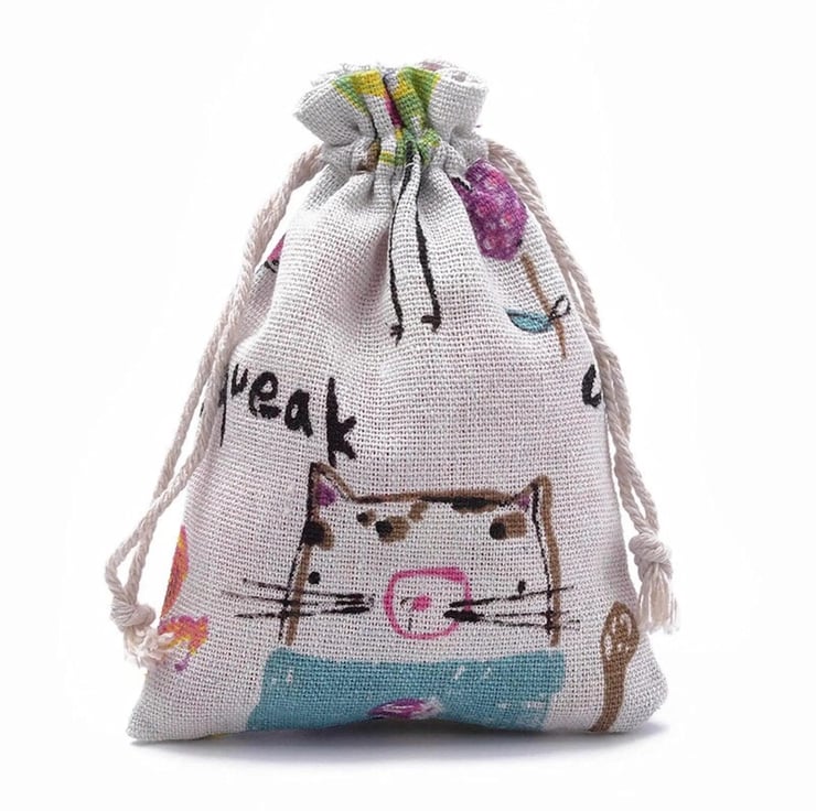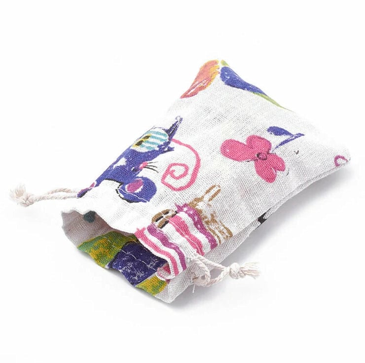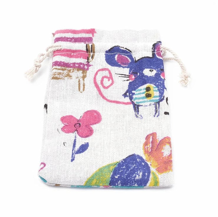 Pack of 5 Mixed Animal Design Drawstring Cotton Style Fabric Bags. Bags Include Cats, Mice, Bears and Birds. Gorgeous Packaging for Your Handmade Jewellery and Gifts.