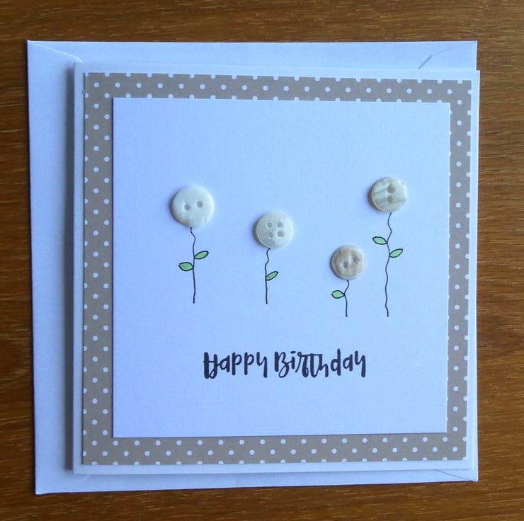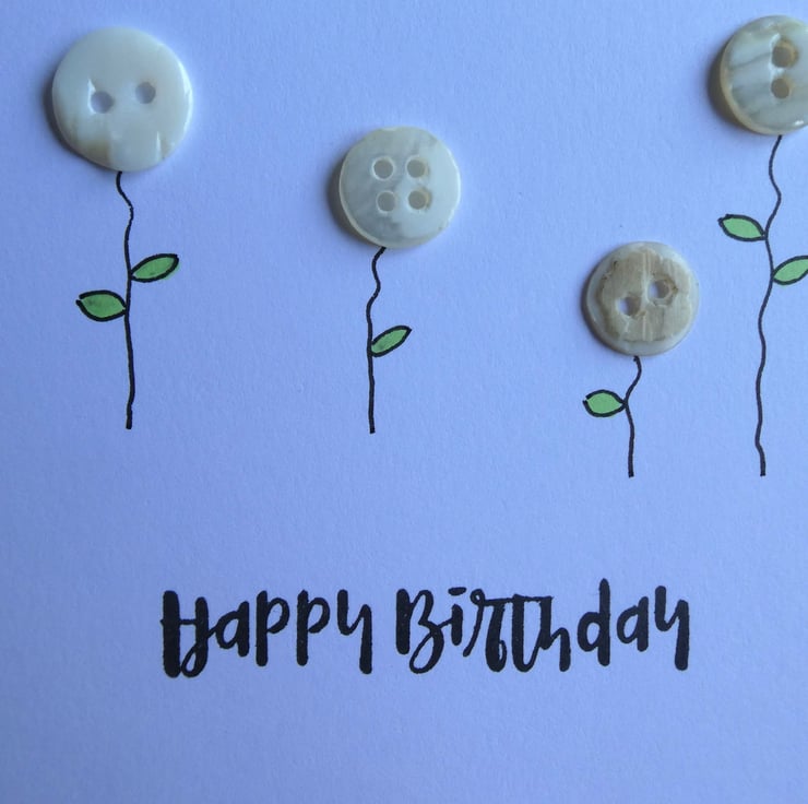 This pretty birthday card has a row of flowers made from vintage buttons and the message Happy Birthday.