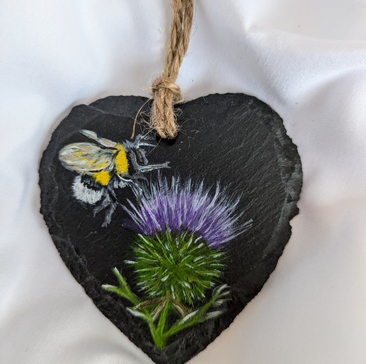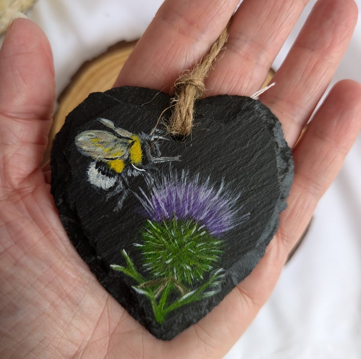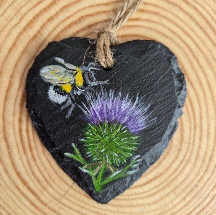 Image is of a gorgeous Bumble Bee with a Thistle, hand painted using acrylic paint and sealed with a matt varnish.