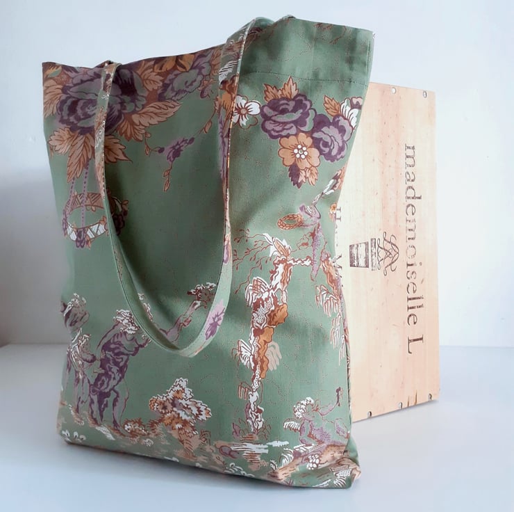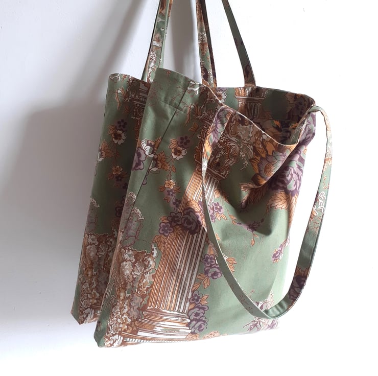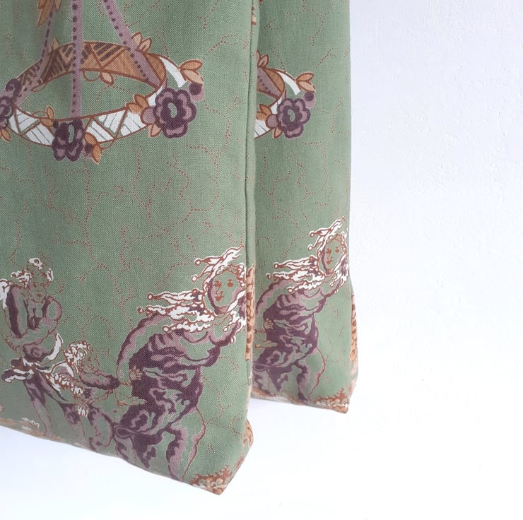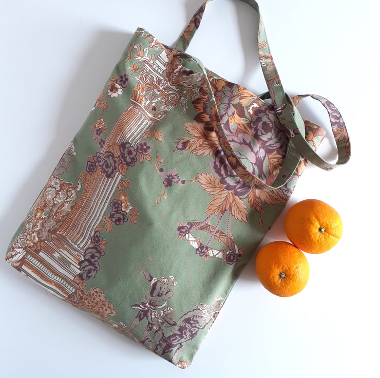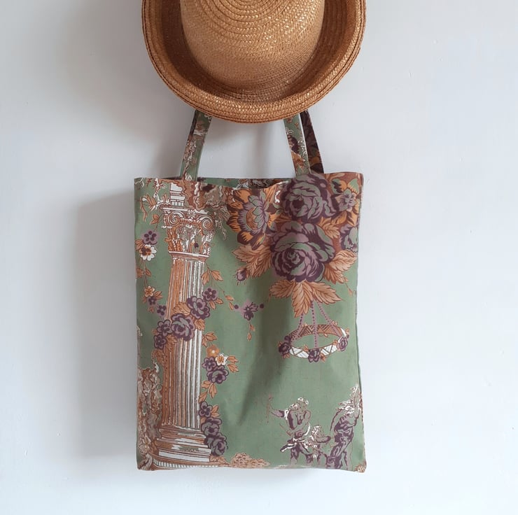 A tote bag or book bag upcycled from a fabulous piece of vintage French cotton. An unusual illustration of classical pillars and cherubs sets it apart, as well as a lovely muted colour palette soft green, gold and maroon.
