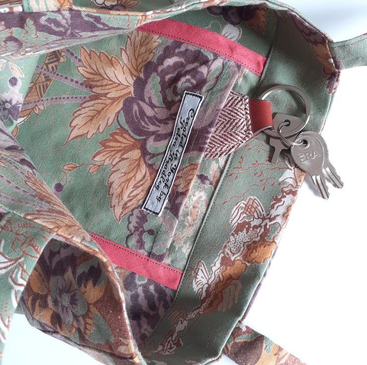 The inside pocket is 15 cm by 12 cm edged with dusty pink binding, and finished off with my own embroidered name tag