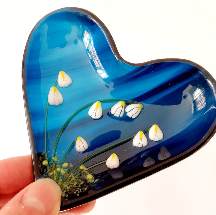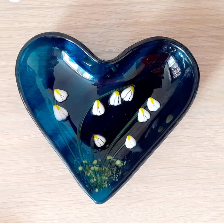 Kiln-fired twice - first to fuse the base glass and decorations together as a flat blank, and then a second time at a lower temperature, to 'slump' it into a heart shaped ceramic mould.