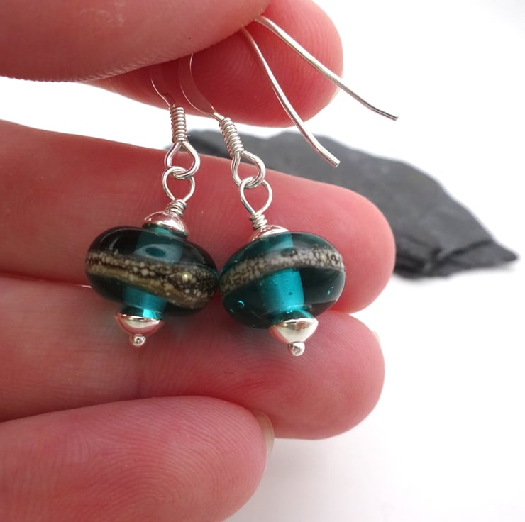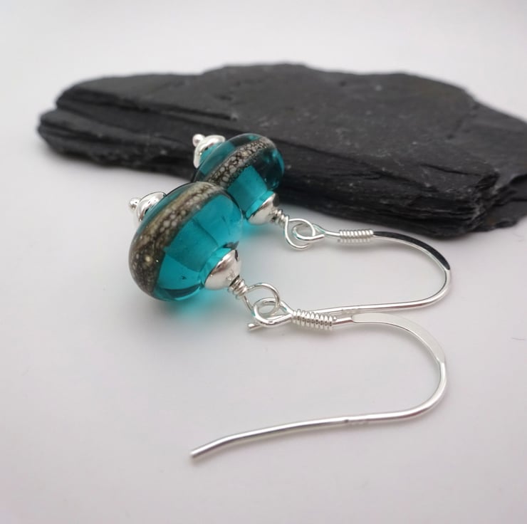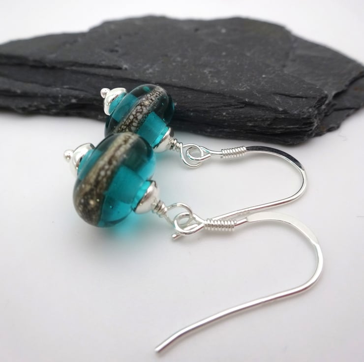 A pair of earrings made with sterling silver ear wires, sterling silver beads and handmade lampwork glass beads.