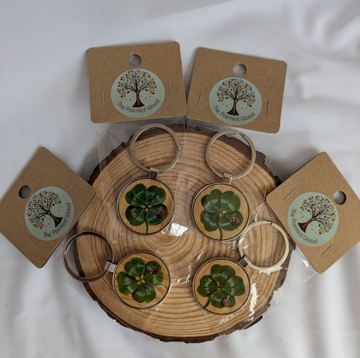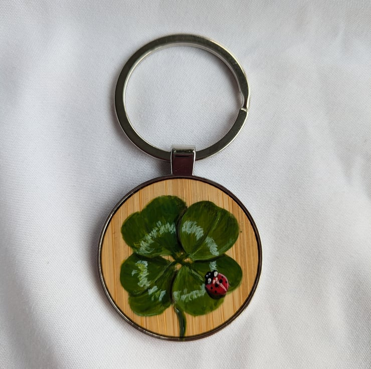 These keyrings have a bamboo insert on which I have delicately hand painted a lucky four leaf clover with a lovely little ladybird.