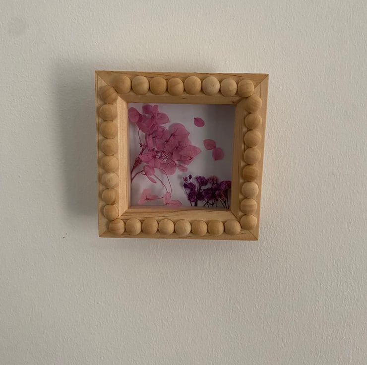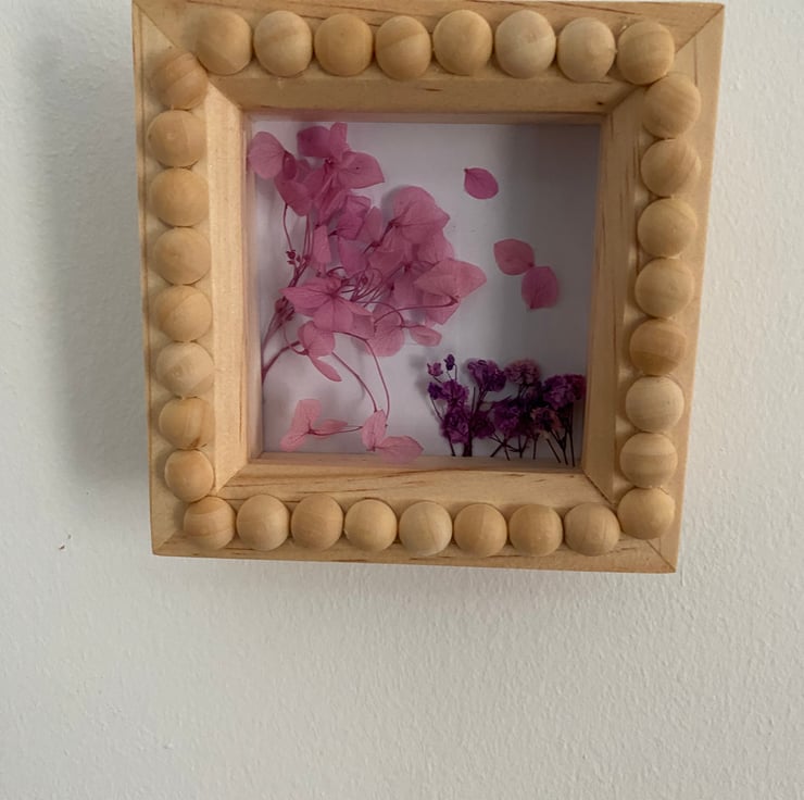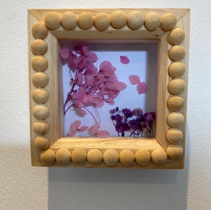Pressed flowers in a hand decorated Bobbin style frame that can be hung on the wall or freestanding on table.