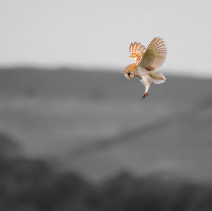 When a barn owl hovers before going in for the kill, there is a grace and beauty in the stillness of this supreme predator. Capturing the bird in colour while editing the background to monochrome really captures the moment.
