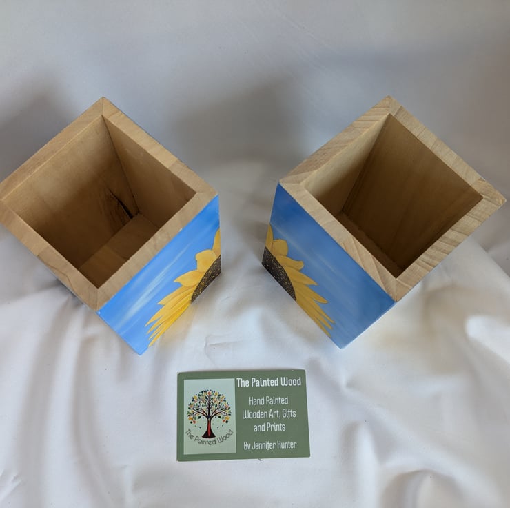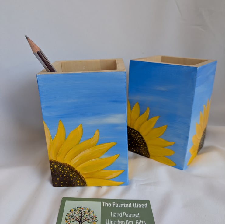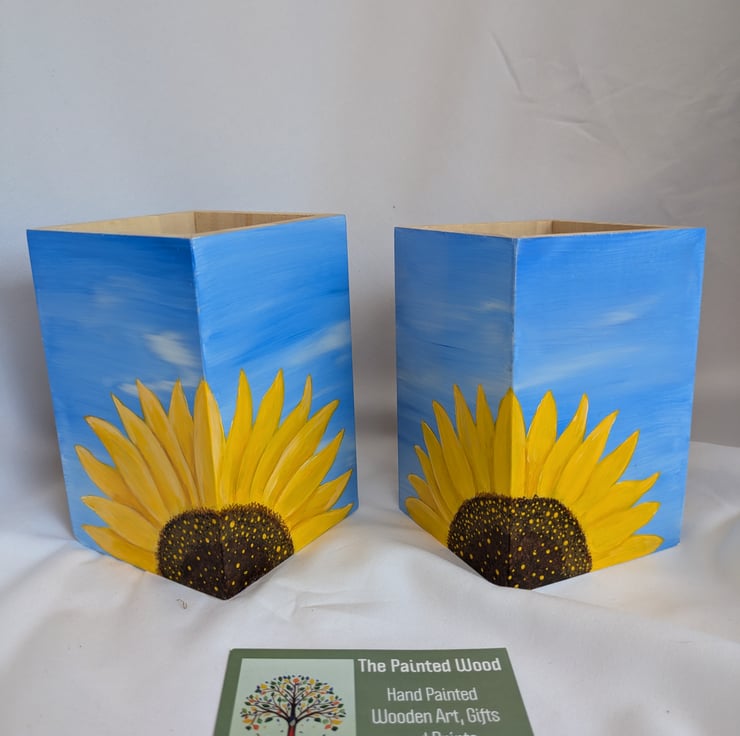 I hand painted on the sunflower design then protected the art work with a hard wearing gloss varnish.