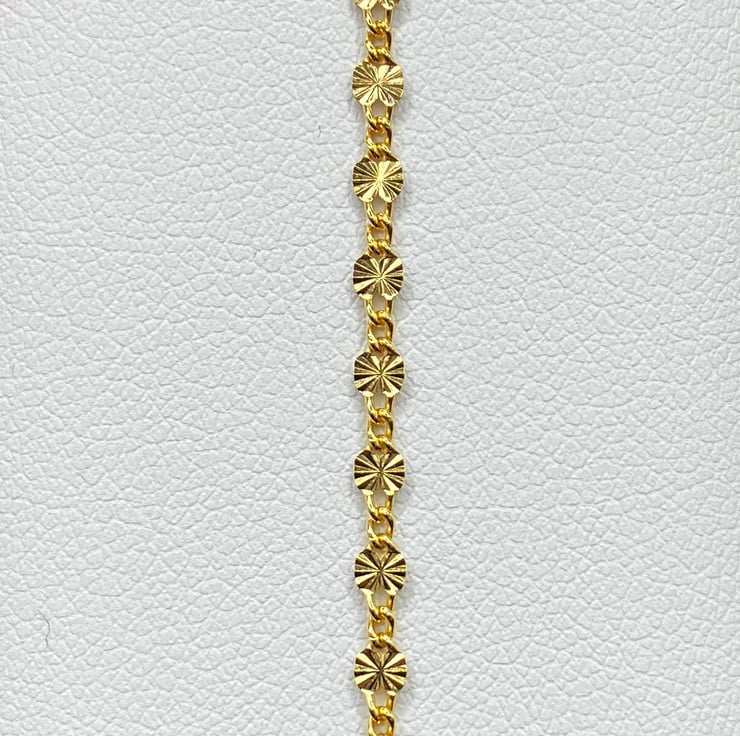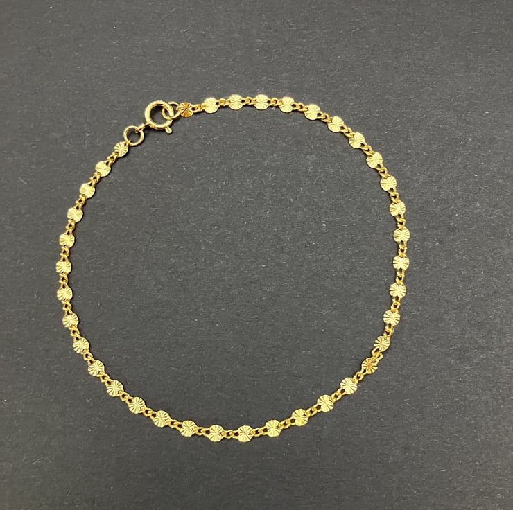 This is a lovely delicate 14 Ct gold filled bracelet made up from little oval sunburst discs all connected together by small links.